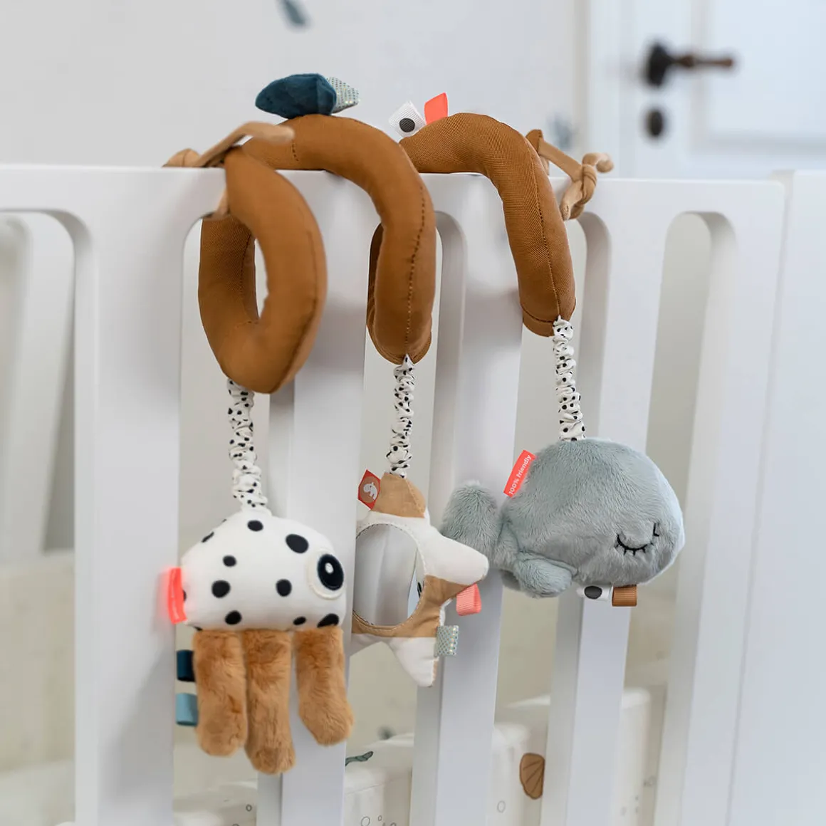 Apportez la spirale des Sea Friends dans des tons chauds de moutarde avec des détails bleu menthe et des points et rayures contrastés. La spirale d’activité flexible peut être fixée au lit de bébé, au siège auto, au landau ou sur le côté d’un parc pour enfants.