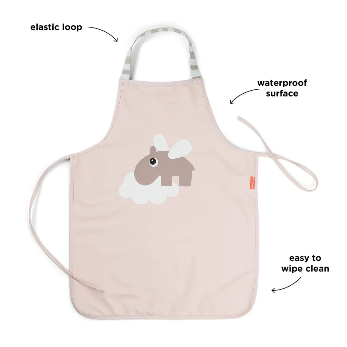 – La boucle élastique au niveau du cou permet aux tout-petits d’enfiler et d’enlever le tablier tout seuls.