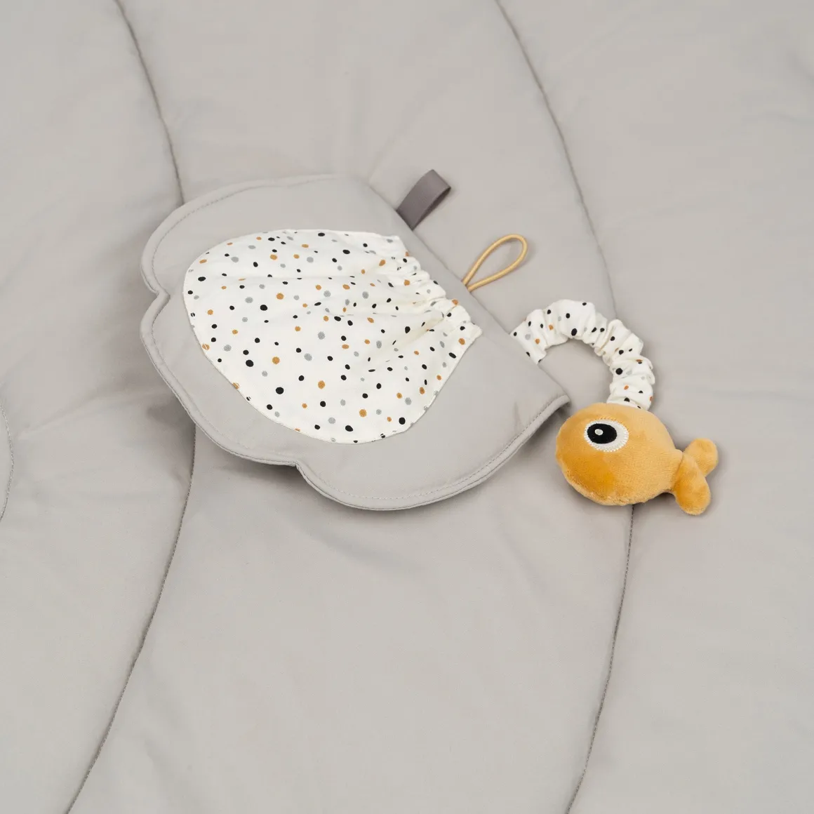 Un jouet qui reste intéressant, que ce soit pour explorer les jouets du dessus, pratiquer le temps du ventre et plus tard s’asseoir pour jouer à cache-cache avec le joli poisson. Ce centre d’activités pour bébé, élégant et amusant, se décline dans des tons doux de Gris avec des touches contrastées de Moutarde/Gris.
