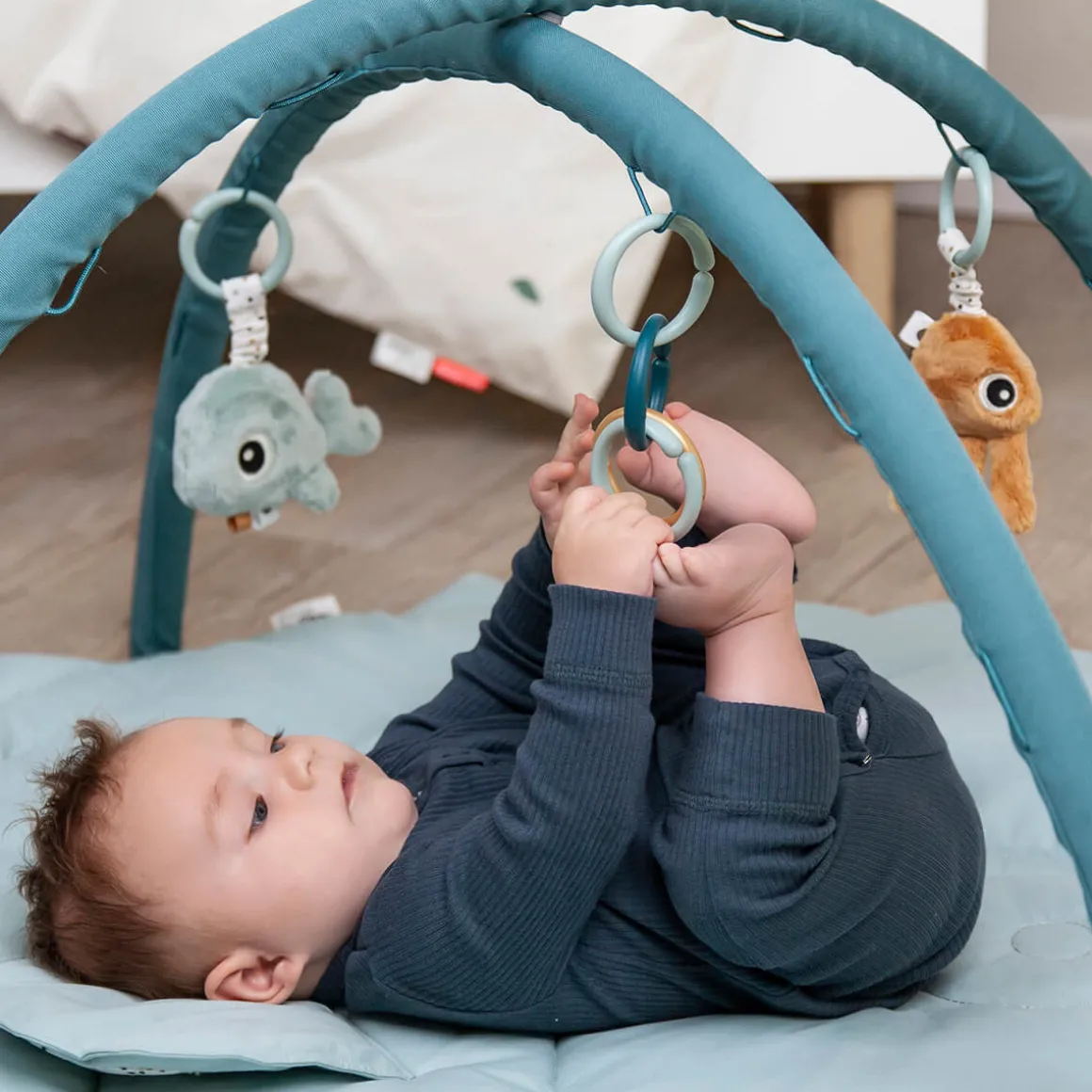 Les tout-petits peuvent s’allonger confortablement sur le tapis éveil en forme de poisson-globe et s’amuser avec les Sea Friends, les nombreuses activités sensorielles et les éléments stimulants. Sur la nageoire caudale souple et mobile de Puffee, les enfants peuvent trouver un soutien supplémentaire pour l’heure du ventre.