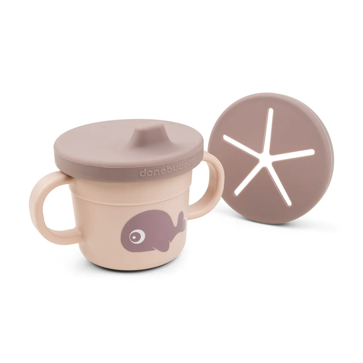 La jolie tasse d’apprentissage et à bec verseur est imprimée de la baleine amusante, Wally d’un côté et des algues de l’autre. La poudre plus foncée des couvercles ajoute un joli détail bicolore.