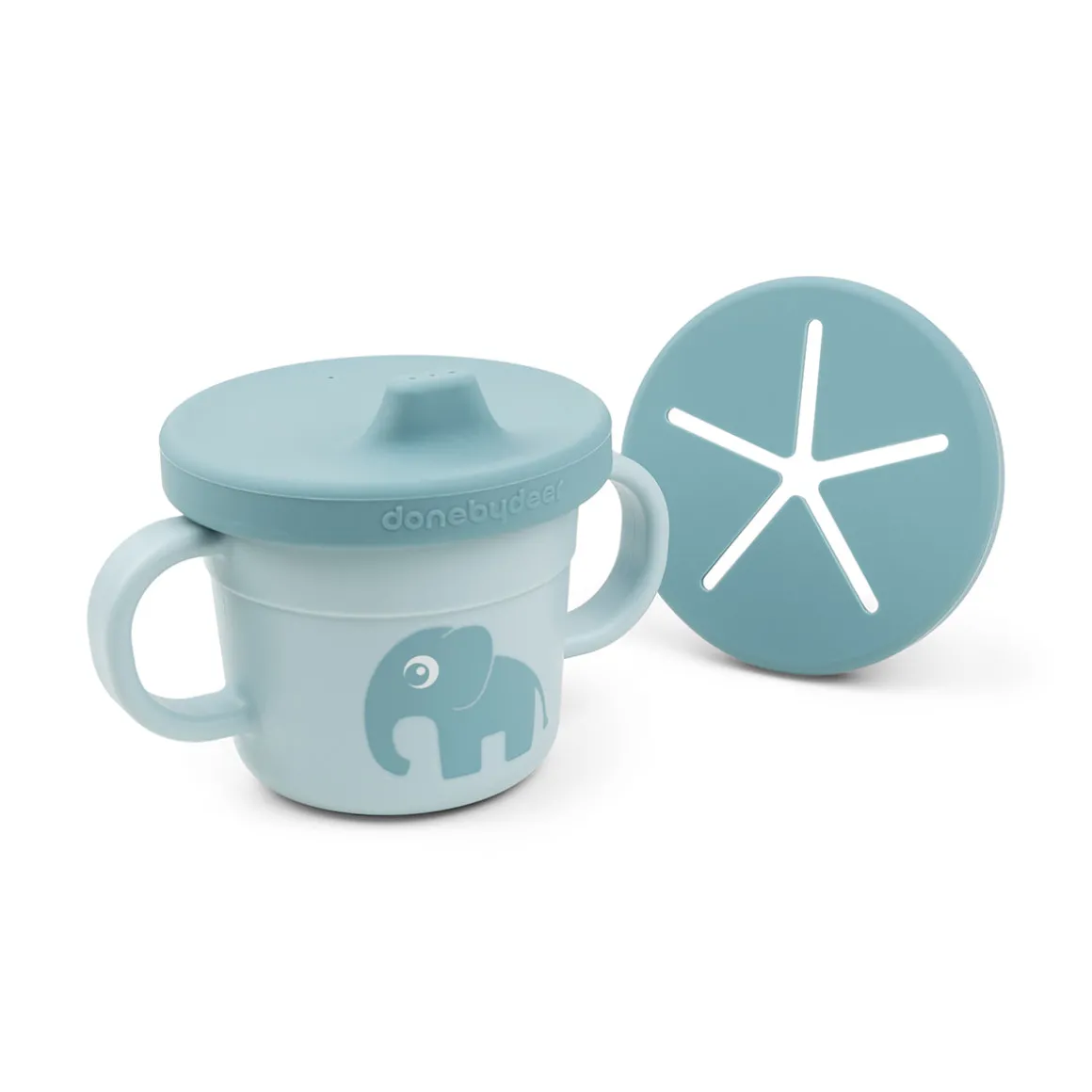 La jolie tasse d’apprentissage et à bec bleu est imprimée de l’éléphant joyeux Elphee d’un côté et des empreintes de pieds d’Elphee de l’autre. Le bleu foncé du couvercle ajoute un joli détail bicolore.