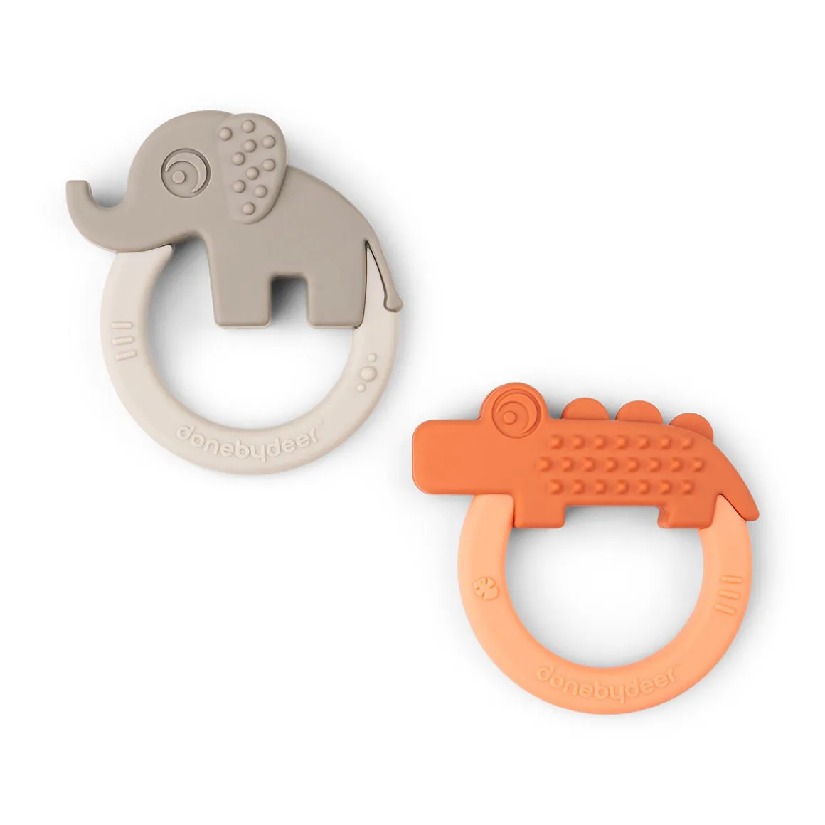 Lot de deux anneaux de dentition en silicone souple représentant les amis des Deer, Croco et Elphee. Les anneaux de dentition sont faciles à tenir pour les enfants et les différentes textures aident à stimuler et à apaiser les démangeaisons des gencives.