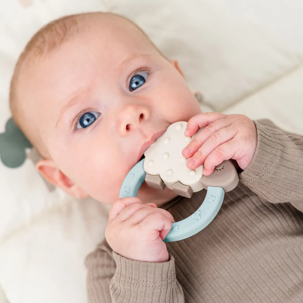The different shapes and textures are designed to soothe sore gums, while the ring makes it easy for your little one to hold. For added relief, simply place it in the refrigerator. With a lovely blue ring and a sand-coloured Sheepy, this teether brings both comfort and charm to teething time. Let a Deer friend help your baby through the teething journey.