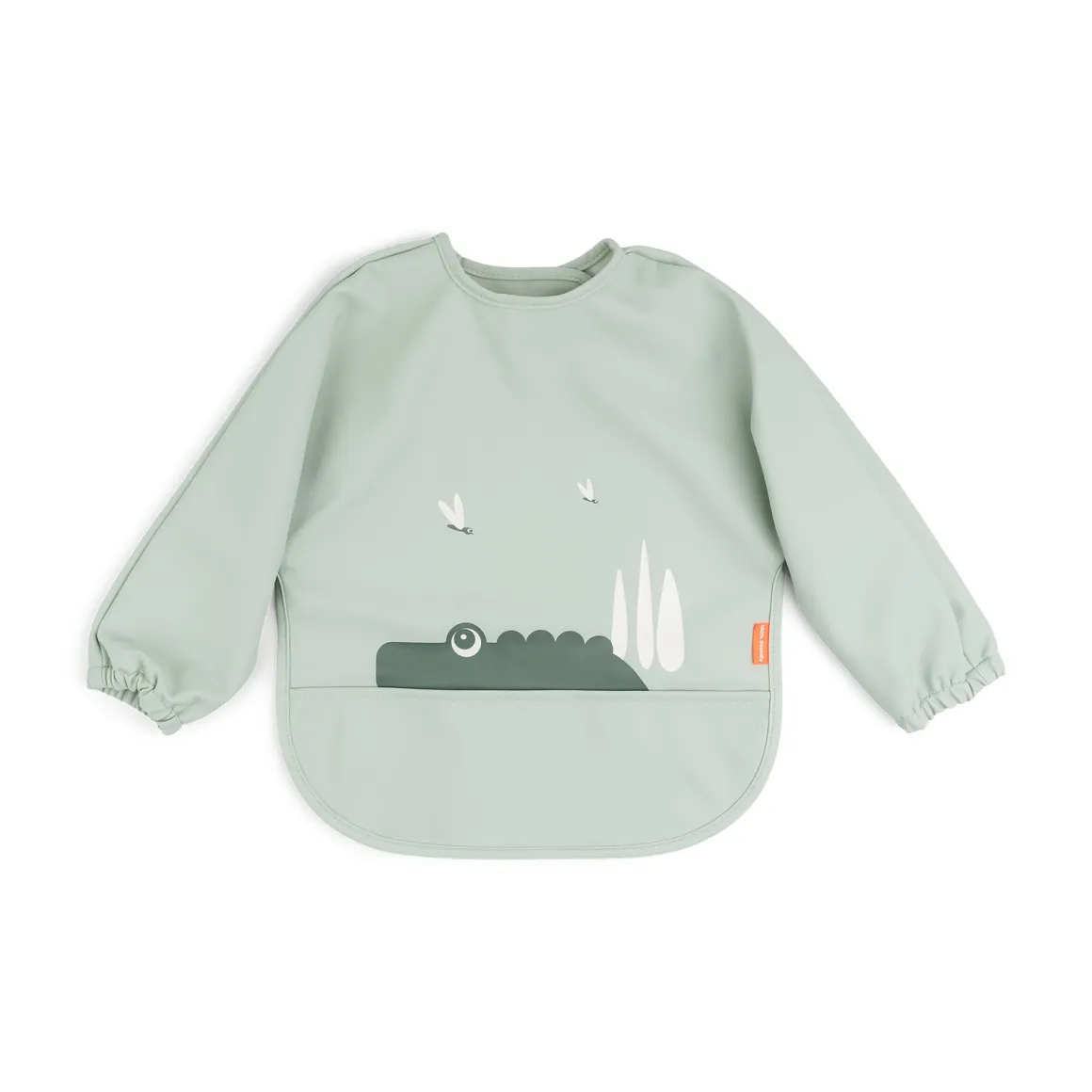 Le bavoir souple est imperméable avec des manches élastiques pratiques pour garder votre enfant au sec. Le bavoir à manches est facile à nettoyer, ce qui vous épargnera beaucoup de temps de nettoyage ! Le mignon bavoir vert est décoré de l’ami Deer Croco et de mouches.