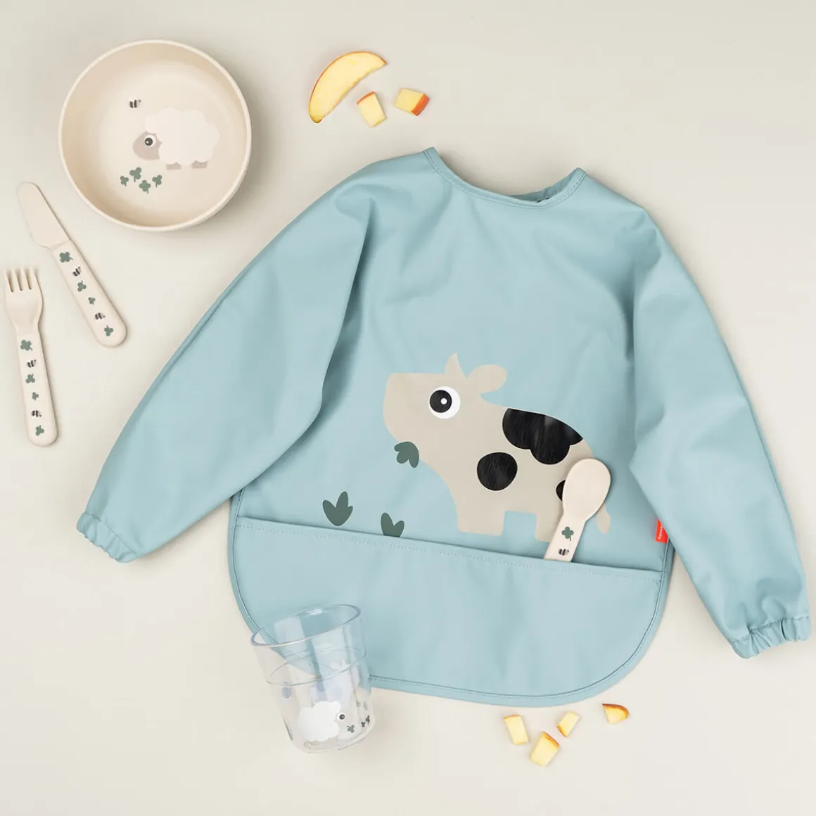 • Bavoir à manches avec poche pour récupérer les aliments