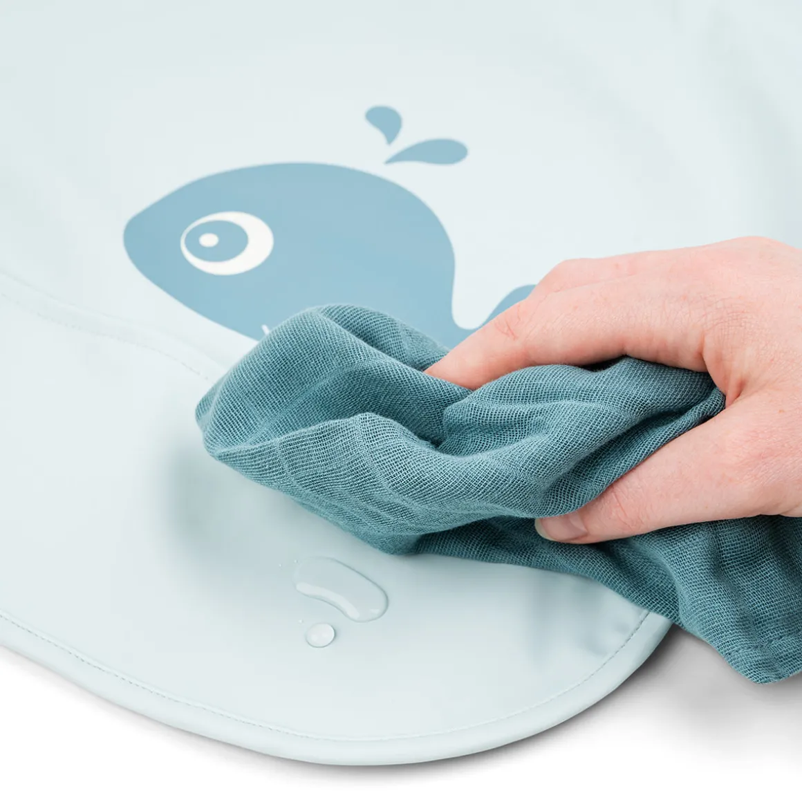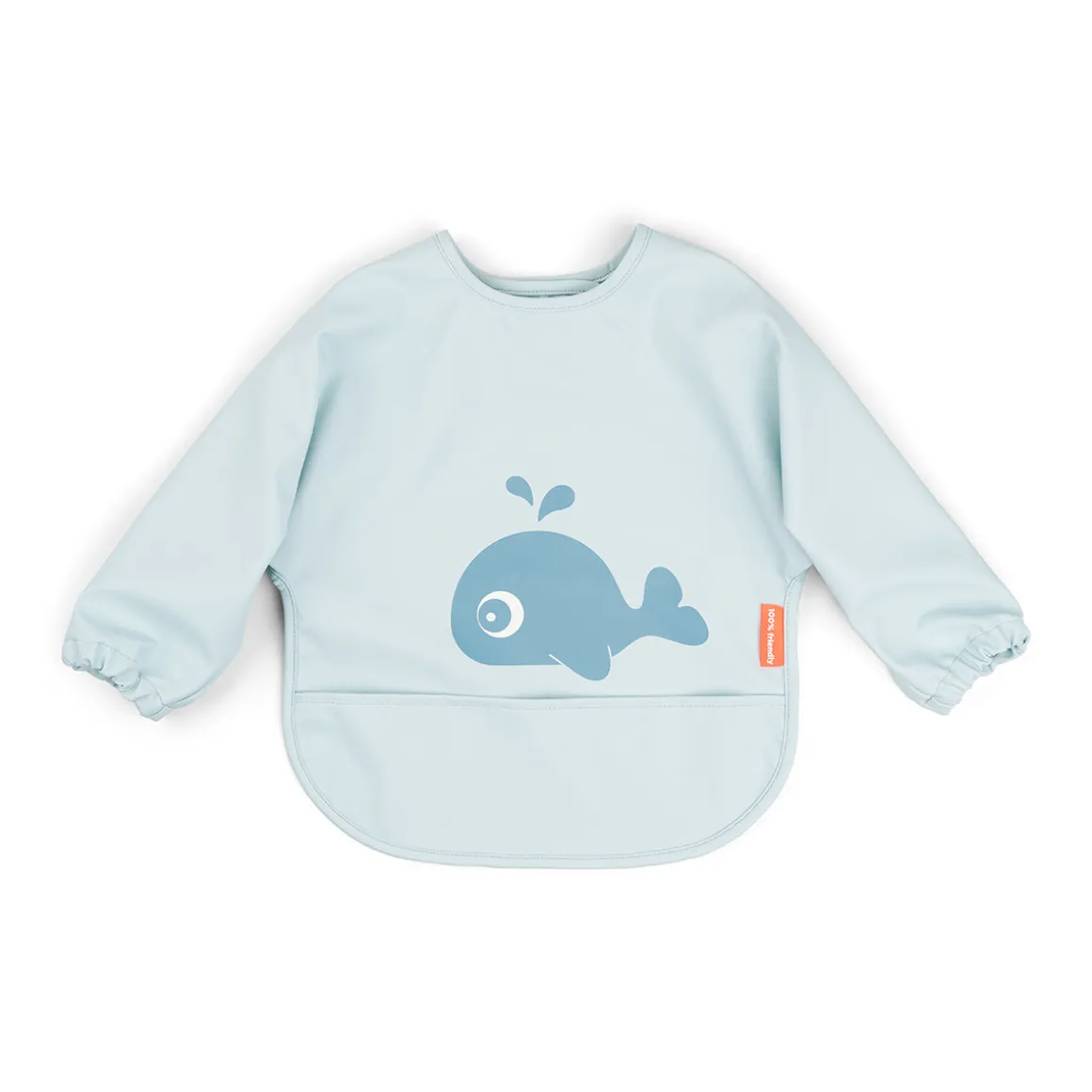 Le bavoir à manches avec poche est d’une belle couleur bleue avec un motif représentant Wally, la puissante baleine, en train d’éclabousser l’eau.