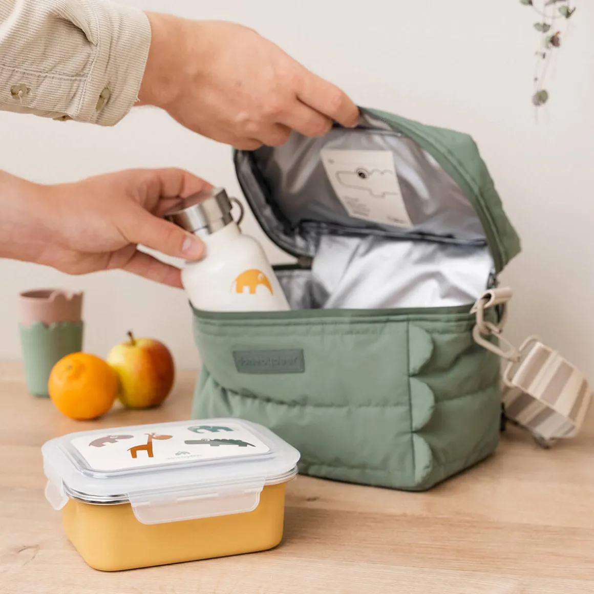 La lunch box en métal pratique est de couleur moutarde. Le couvercle est décoré des amis Deer Croco, Elphee, Raffi og Ozzo dans des tons doux de vert, bleu, moutarde et poudre.
