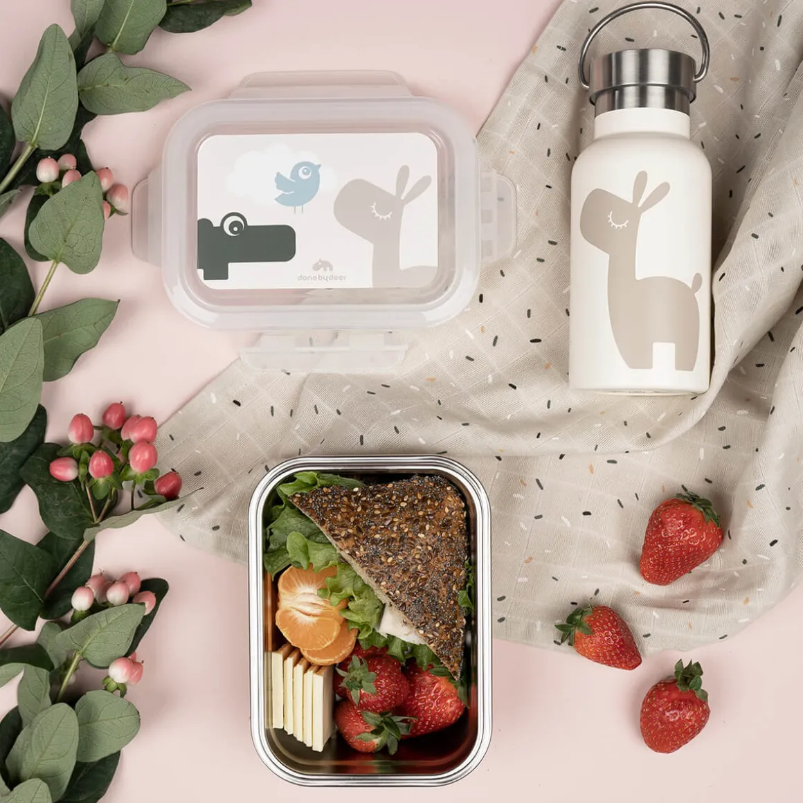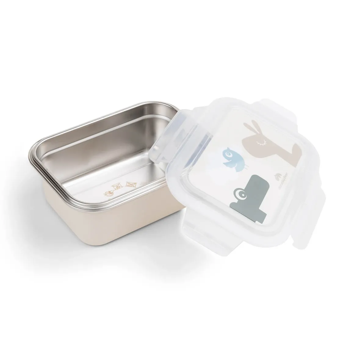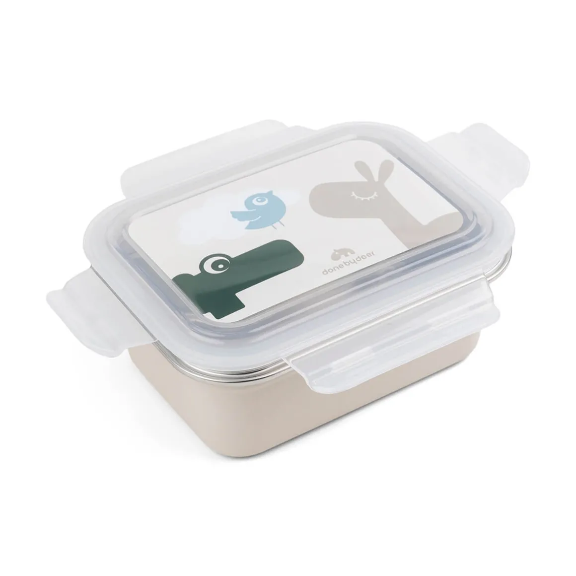 La lunch box en métal est d’un ton beige sable. Le couvercle est décoré des amis Deer Croco, Lalee et Birdee dans des tons doux de vert, de sable et de bleu.