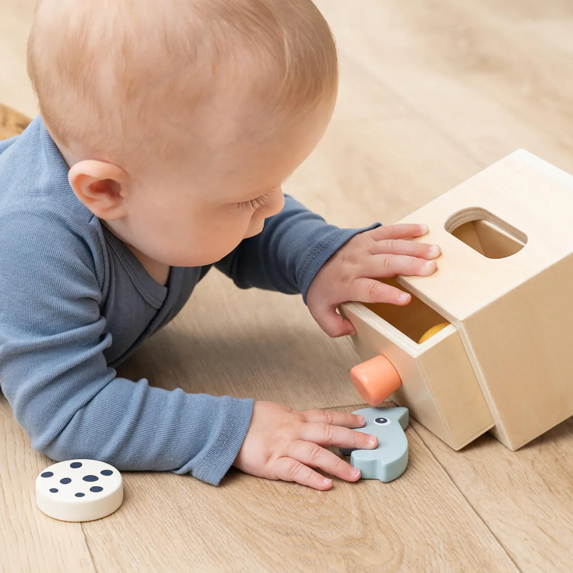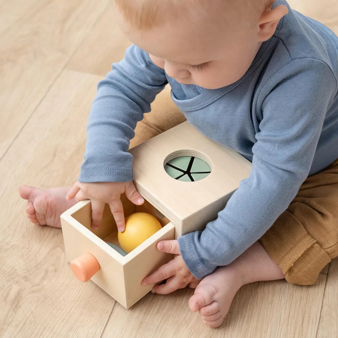 Notre stimulant coffret Cache-cache en bois est idéal à partir de 10 mois. Il permet à votre enfant de jouer à cache-cache, ce qui favorise la coordination œil-main, la motricité fine et la résolution de problèmes. Le coffret comprend une figurine représentant Nozo le rhinocéros, une balle jaune à hochet et un bloc rond noir/blanc, encourageant l’exploration sensorielle.