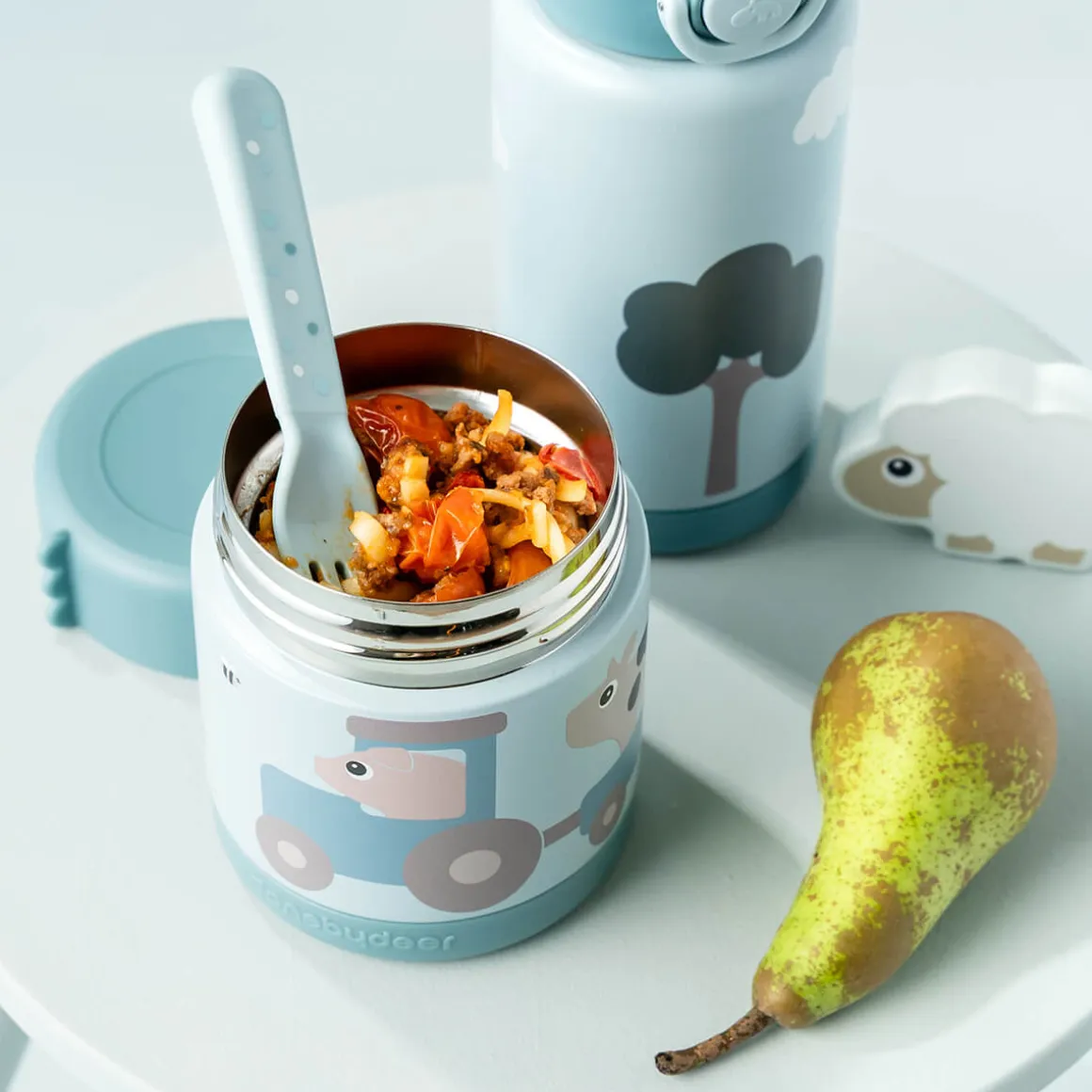 Dans une jolie teinte bleue, le pot est égayé par le duo ludique Dotti et Pigee, qui apportent des rires et de la bonne compagnie à l’heure du goûter, où que l’on aille dans la journée.