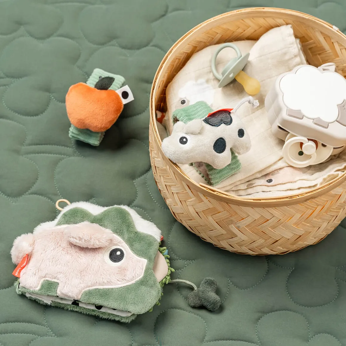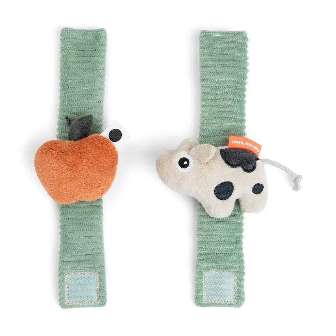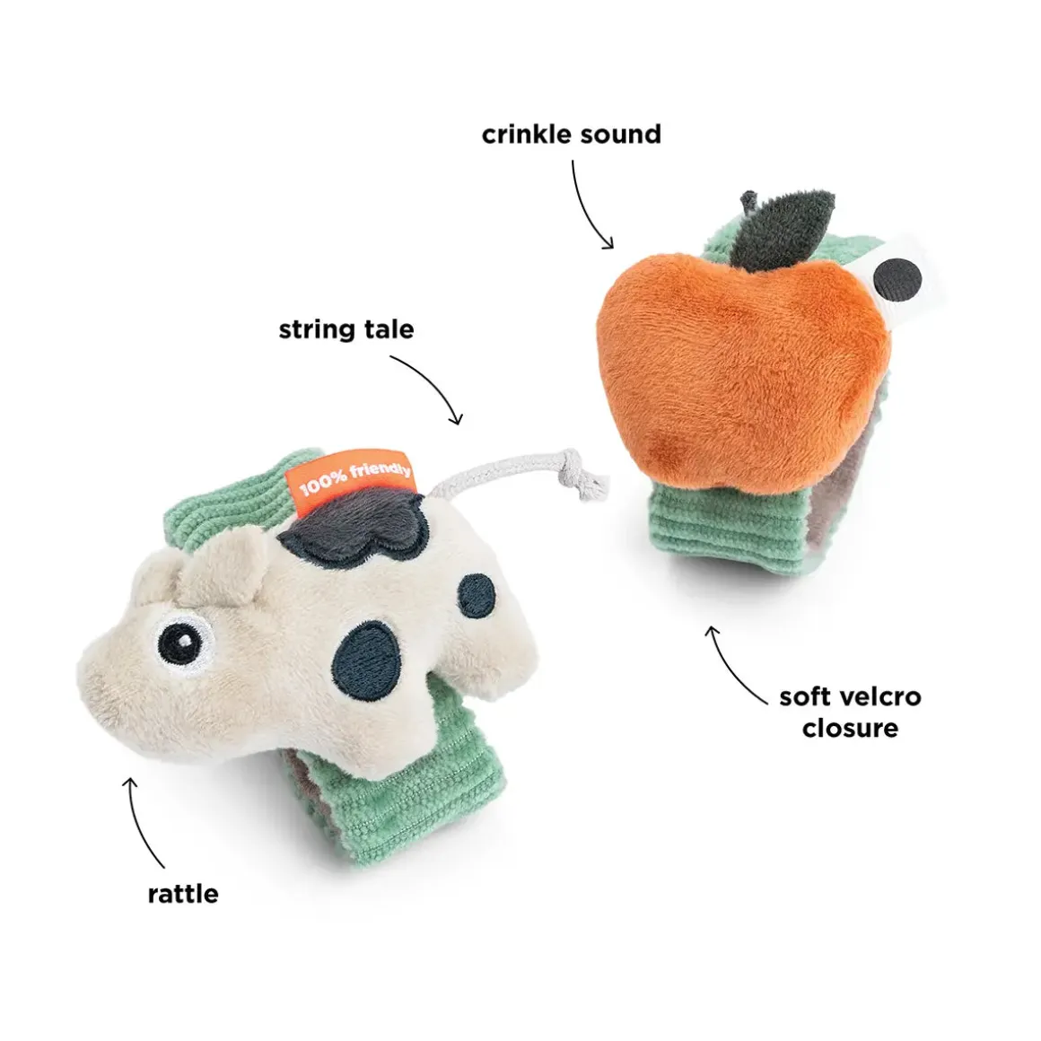 The contrasting spots along with colourful details, provide visual stimulation, while the rattling and crinkling sounds capture your child’s attention. One rattle features Dotti, and the other an apple, offering playful variety. Designed to fit both wrists and ankles, the set allows your baby to move freely while Dotti motivates exploration and movement.