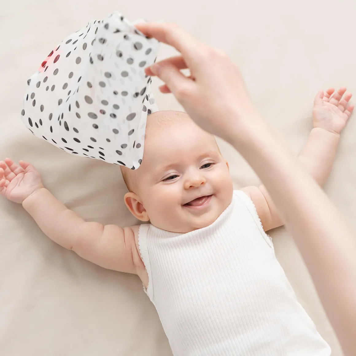 – Les points ludiques et l’imprimé très contrasté rendent le foulard idéal pour la stimulation visuelle, les jeux de cache-cache ou pour attirer l’attention de votre bébé en le faisant bouger.