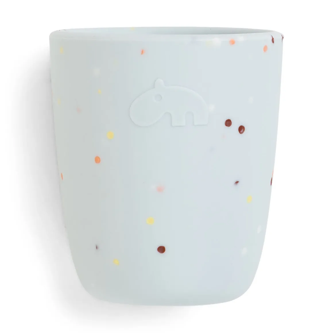 Un bol à carottes bleu, une tasse à confettis bleu clair et une cuillère bleu foncé font de ce coffret repas une idée de cadeau parfaite pour les nouveaux petits mangeurs.