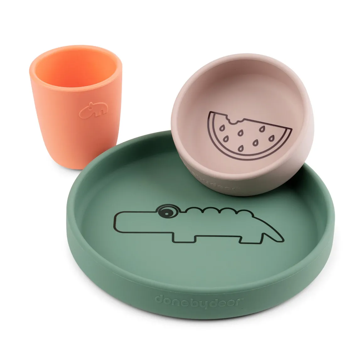 Une assiette verte Croco, un bol en forme de pastèque poudrée et une mini tasse rouge corail fraîche font de ce coffret repas une idée de cadeau parfaite pour les petits mangeurs.