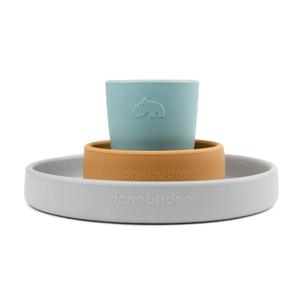 Une assiette grise Elphee, un bol à carottes moutarde et une mini tasse bleu clair font de ce coffret repas une idée de cadeau parfaite pour les petits mangeurs.