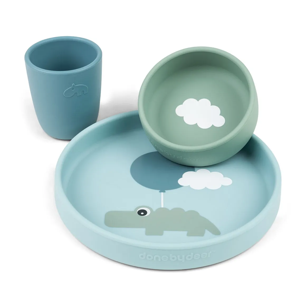 Une assiette Croco bleue, un bol Vert/Vert et une mini tasse bleu foncé font de ce set de repas pour enfants une idée de cadeau parfaite pour les petits mangeurs.