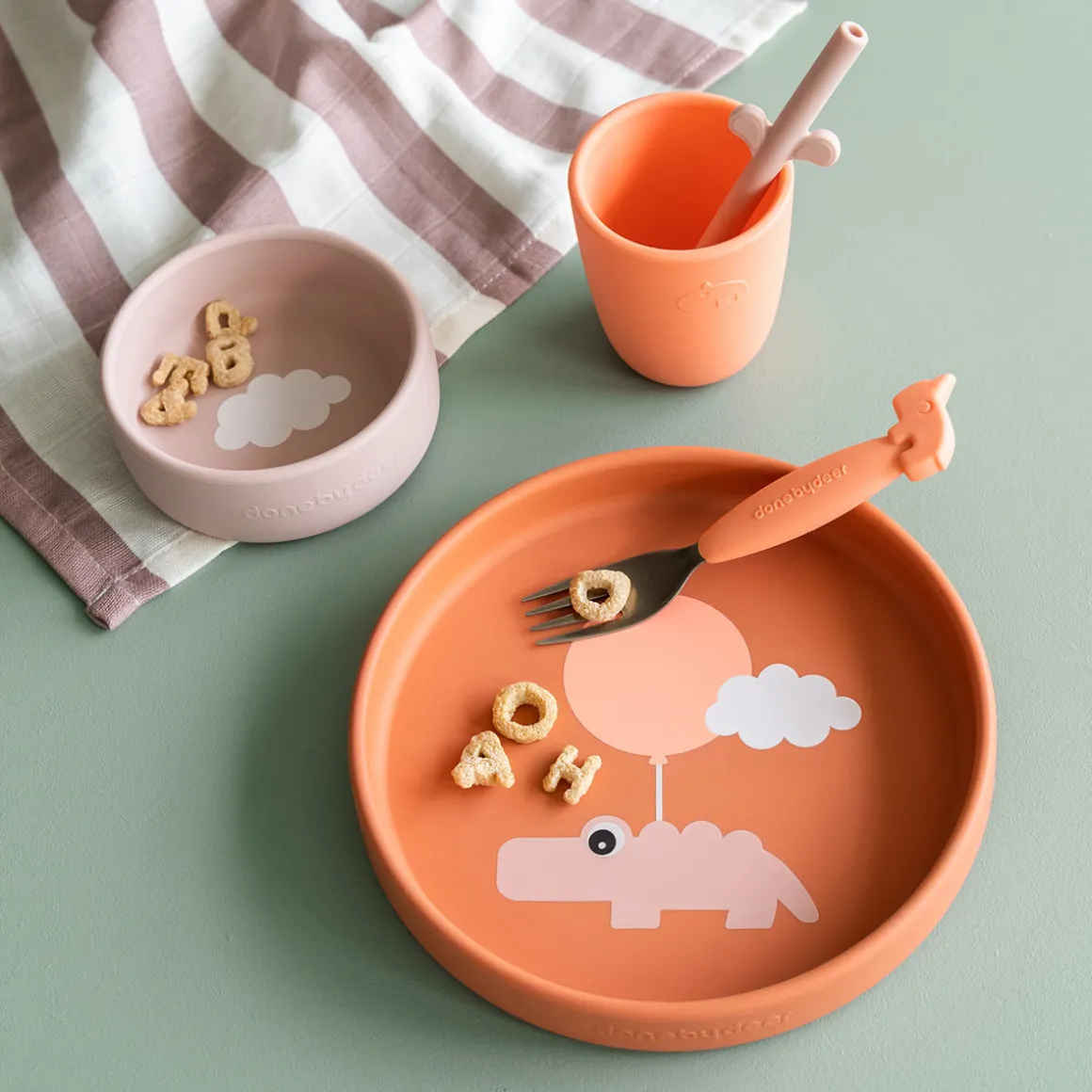 Une assiette en Corail de couleur Papaye, un bol en forme de nuage de poudre et une mini tasse en corail frais font de ce set de repas pour enfants une idée de cadeau parfaite pour les petits mangeurs.