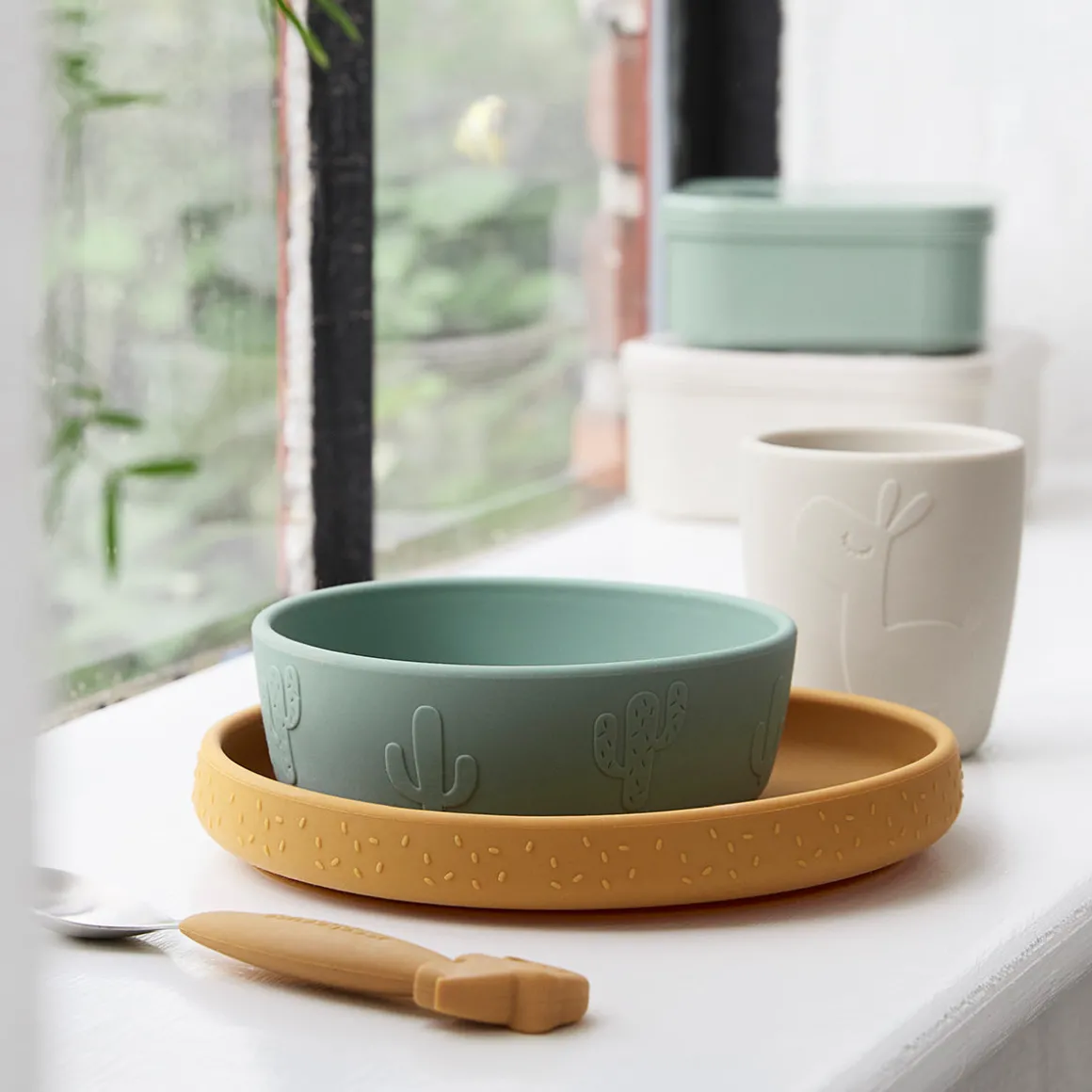 Dressez une table amusante avec le coffret repas Silicone Stick&Stay et Lalee comme compagnon cool. L’assiette moutarde, le bol vert et la mini tasse sable sont décorés de motifs en relief avec Lalee, Birdee, des confettis festifs et des cactus pétillants.