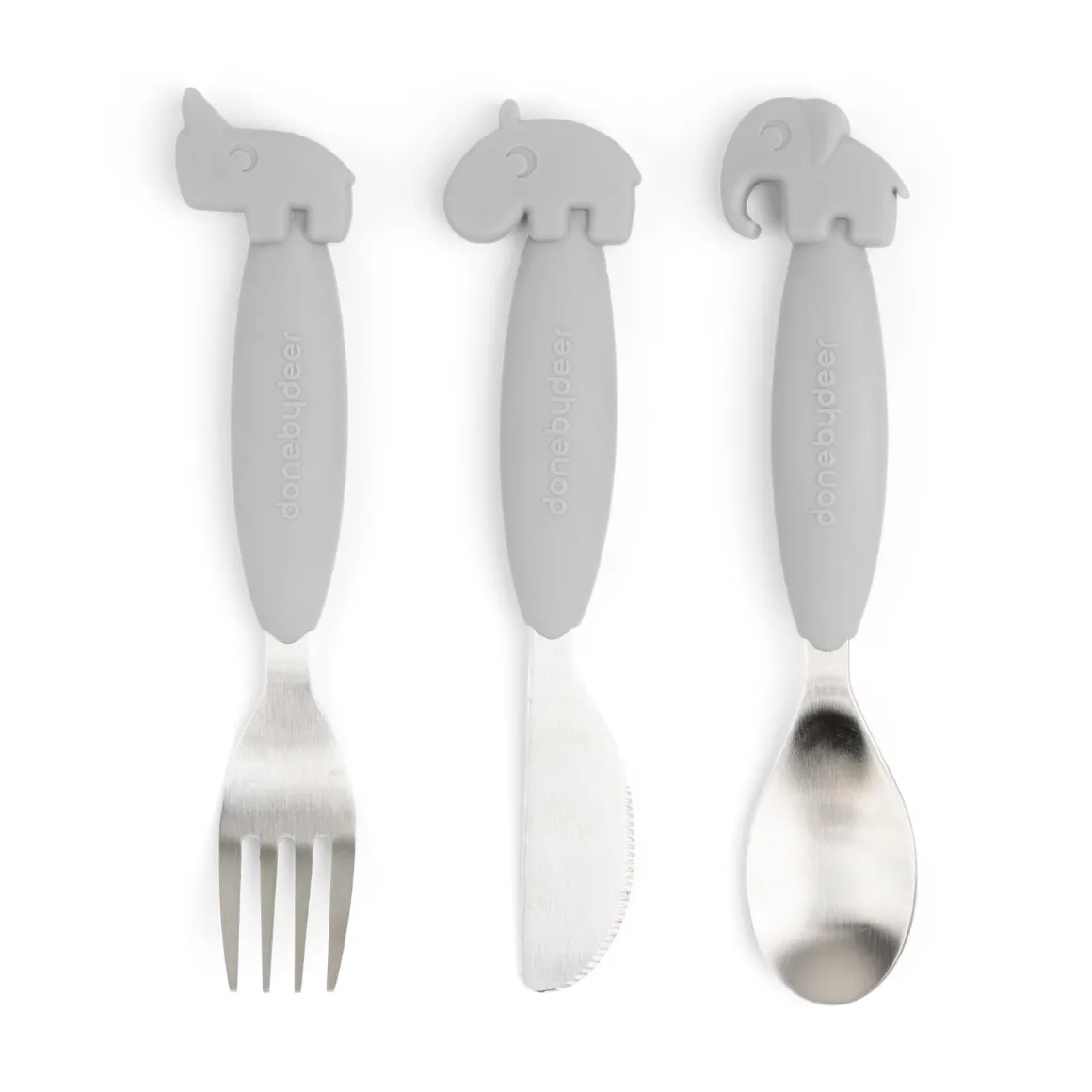 Le couteau Ozzo, la fourchette Nozo et la cuillère Elphee de couleur grise sont assortis à l’ensemble de la collection de vaisselle Done by Deer.