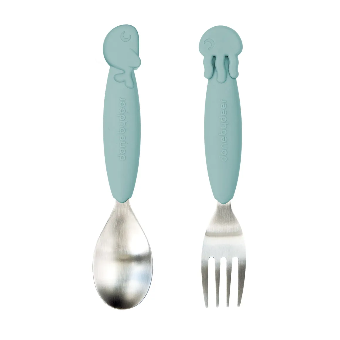 Les couverts Sea Friends sont d’une douce couleur bleu pastel, assortie à la vaisselle pour enfants Done by Deer.