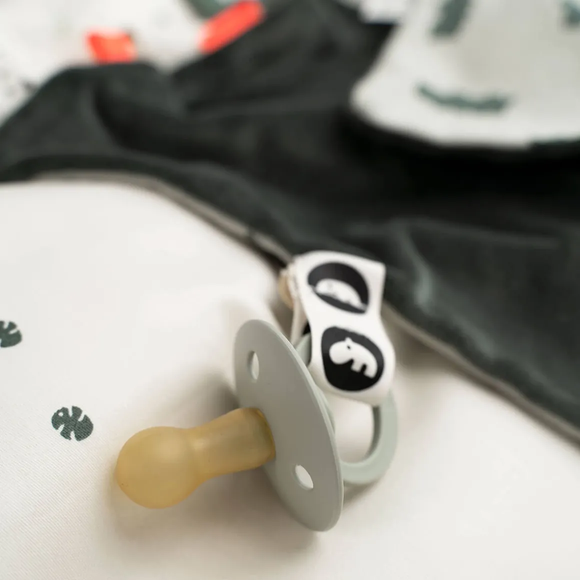 Le mignon anneau de dentition en silicone avec des écailles de crocodile et différentes textures pour stimuler et apaiser les démangeaisons des gencives peut être détaché et utilisé seul. Une attache velcro pratique et une boucle élastique permettent d’attacher une sucette pour la garder à portée de main.
