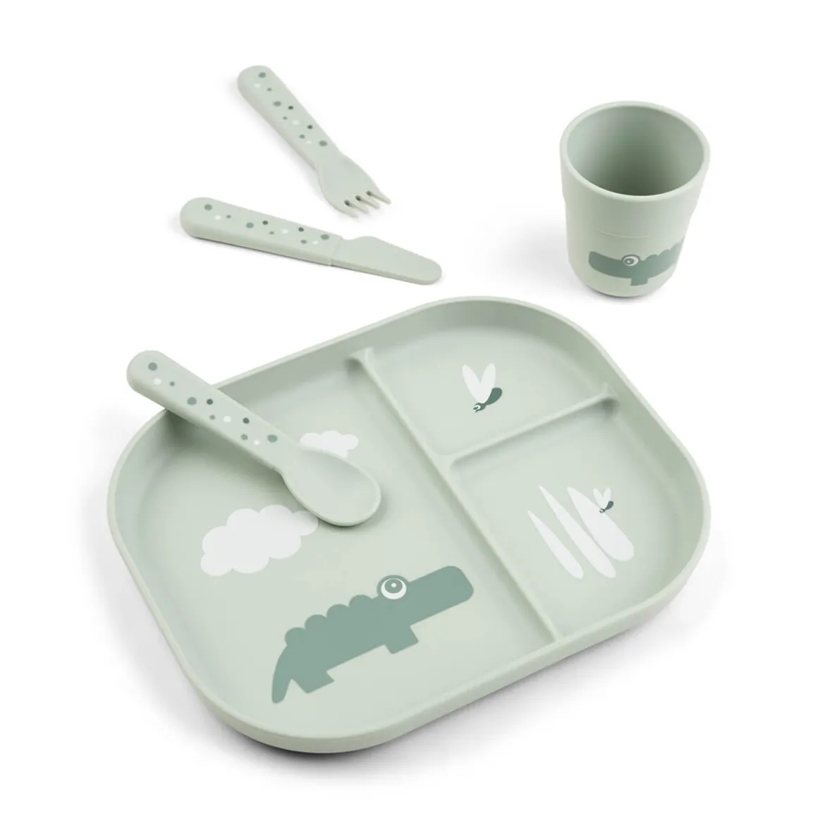 L’ensemble vert est imprimé d’un motif sympathique représentant Croco, le crocodile, en train de contempler un couple de lucioles. La curiosité de Croco inspirera votre enfant à explorer les aliments dans l’assiette.