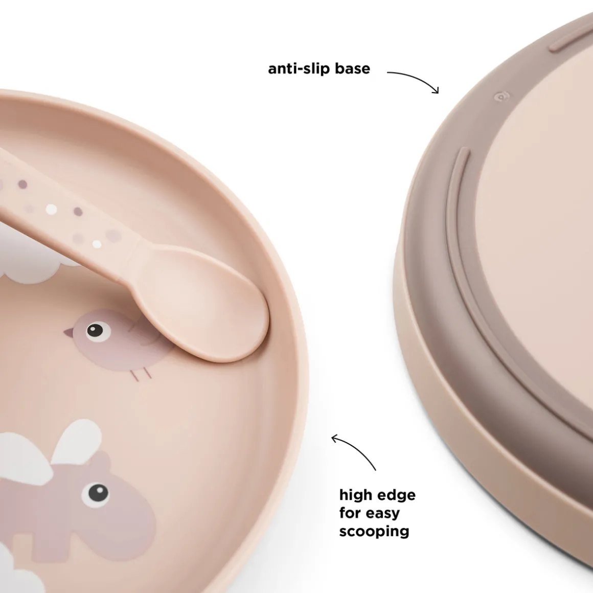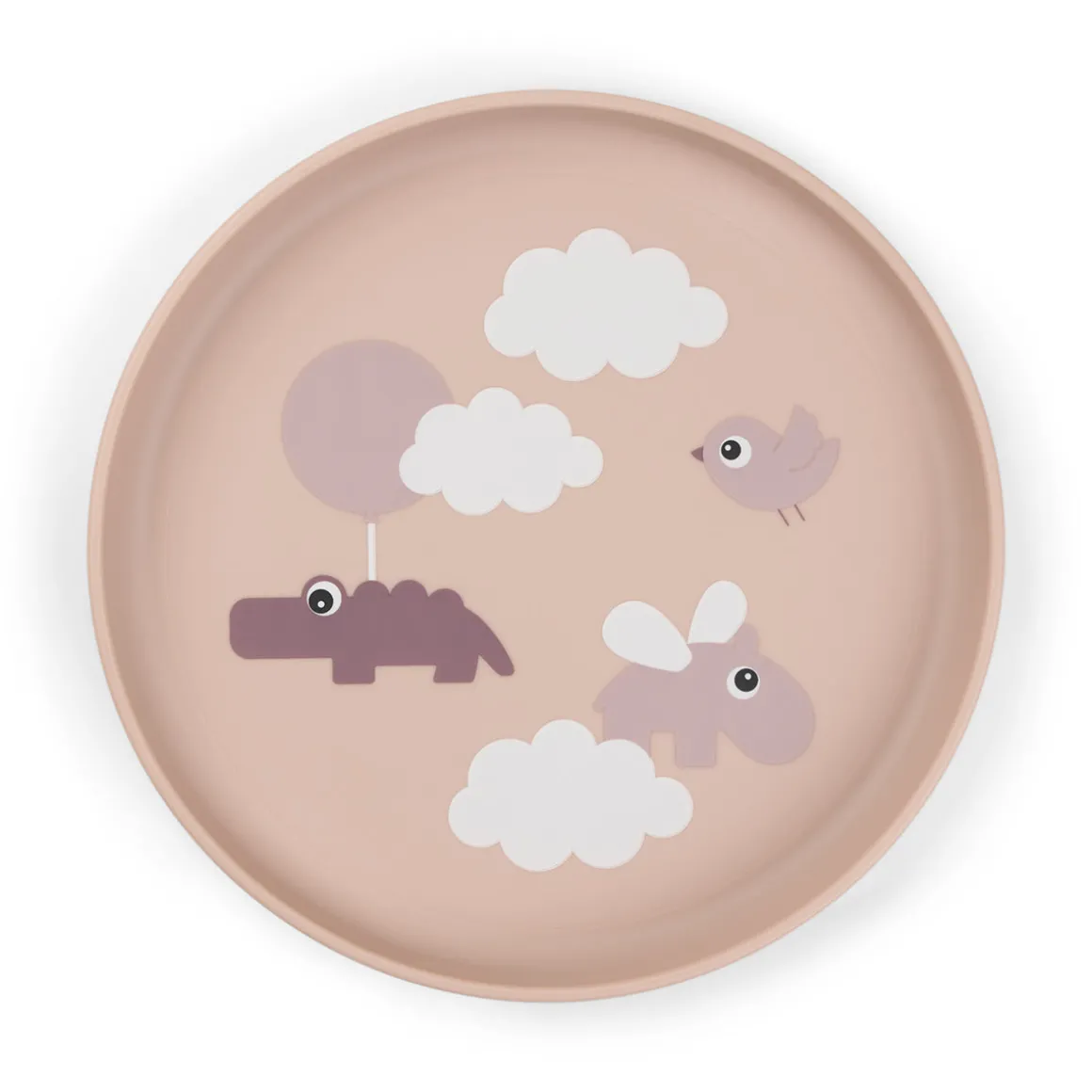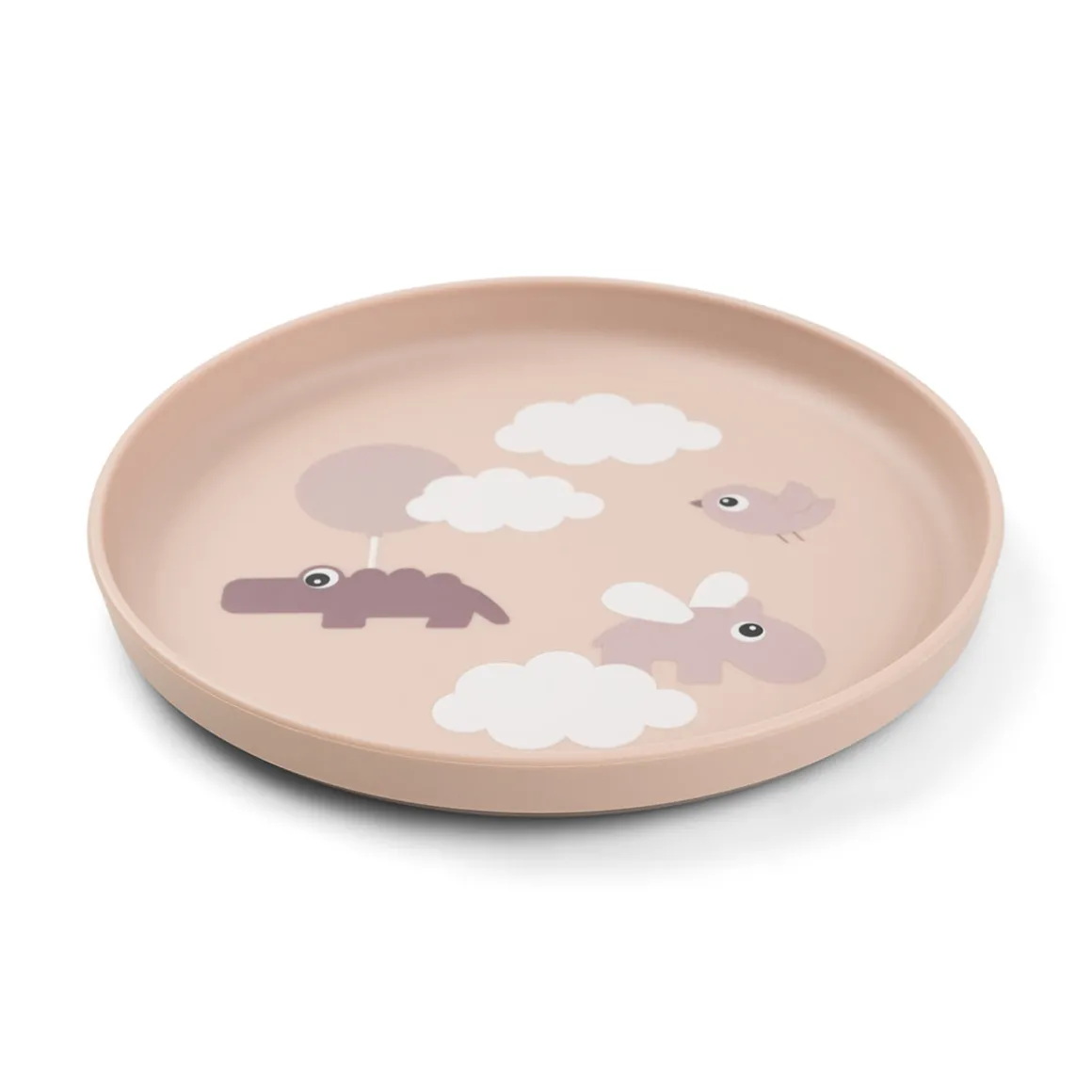 L’assiette Rose est imprimée d’un motif ludique Happy Clouds. Croco, Ozzo et Birdee explorent le monde parmi les nuages et inviteront votre enfant à découvrir de nouvelles saveurs et consistances. La poudre plus foncée de la base ajoute un joli détail bicolore.