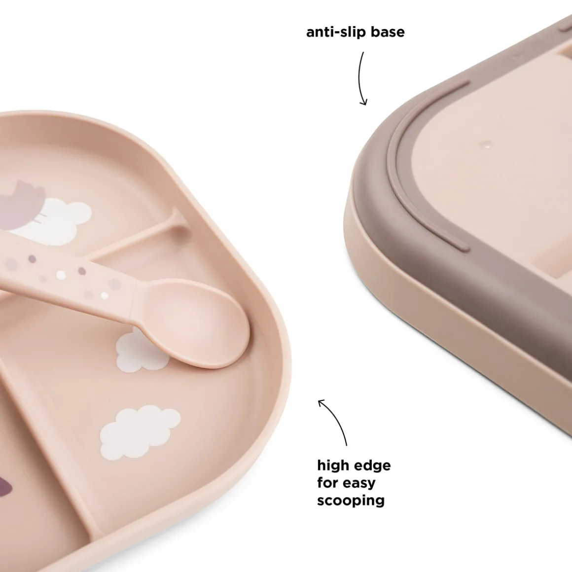 Les bords hauts de l’assiette aideront votre enfant à ramasser les aliments, tandis que la base antidérapante pratique permet à l’assiette de rester en place. L’assiette est conçue pour la vie quotidienne avec les enfants et passe au lave-vaisselle et au micro-ondes.