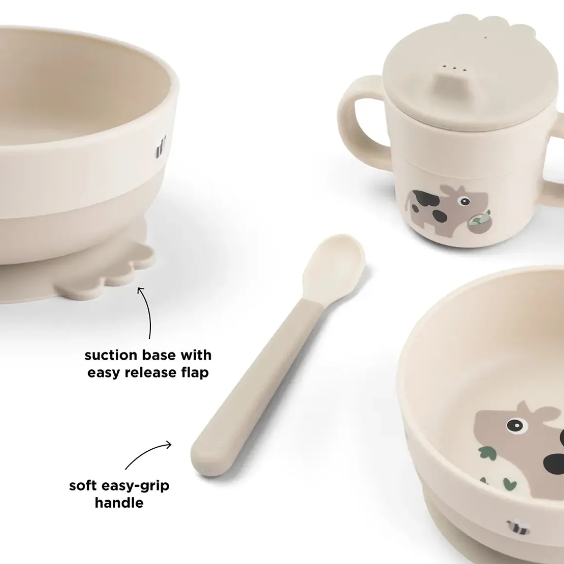 Le set de premier repas en sable est décoré d’un motif ludique Tiny farm. Le bol est orné d’un motif représentant Dotti et Birdee et la tasse d’apprentissage à deux anses est également ornée de la sympathique vache. Les éléments de sable plus foncés ajoutent un joli détail bicolore.