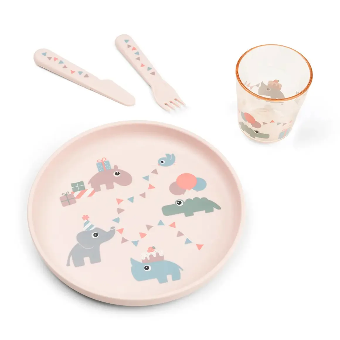 – Coffret repas dans une couleur poudrée contenant une assiette, un verre, un couteau, une fourchette et un petit livre.