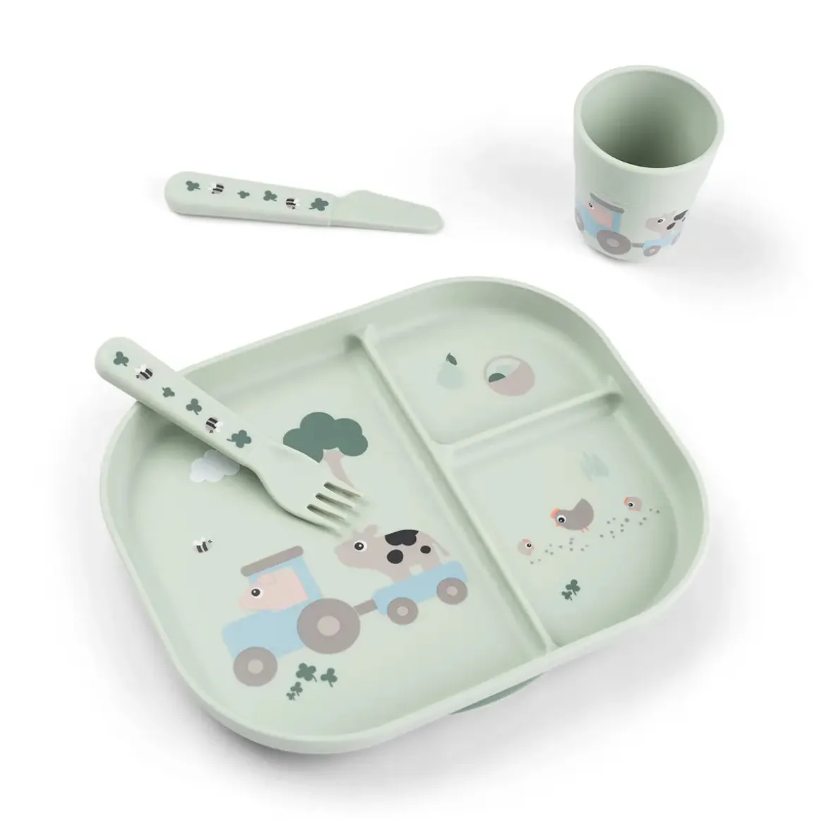 Dans une couleur verte fraîche, l’ensemble prend vie avec nos Deer friends, Pigee et Dotti. Laissez votre enfant découvrir des motifs amusants, et n’oubliez pas de garder un œil sur Clucky et ses petits poussins qui grignotent – l’heure du repas vient de devenir beaucoup plus amusante !