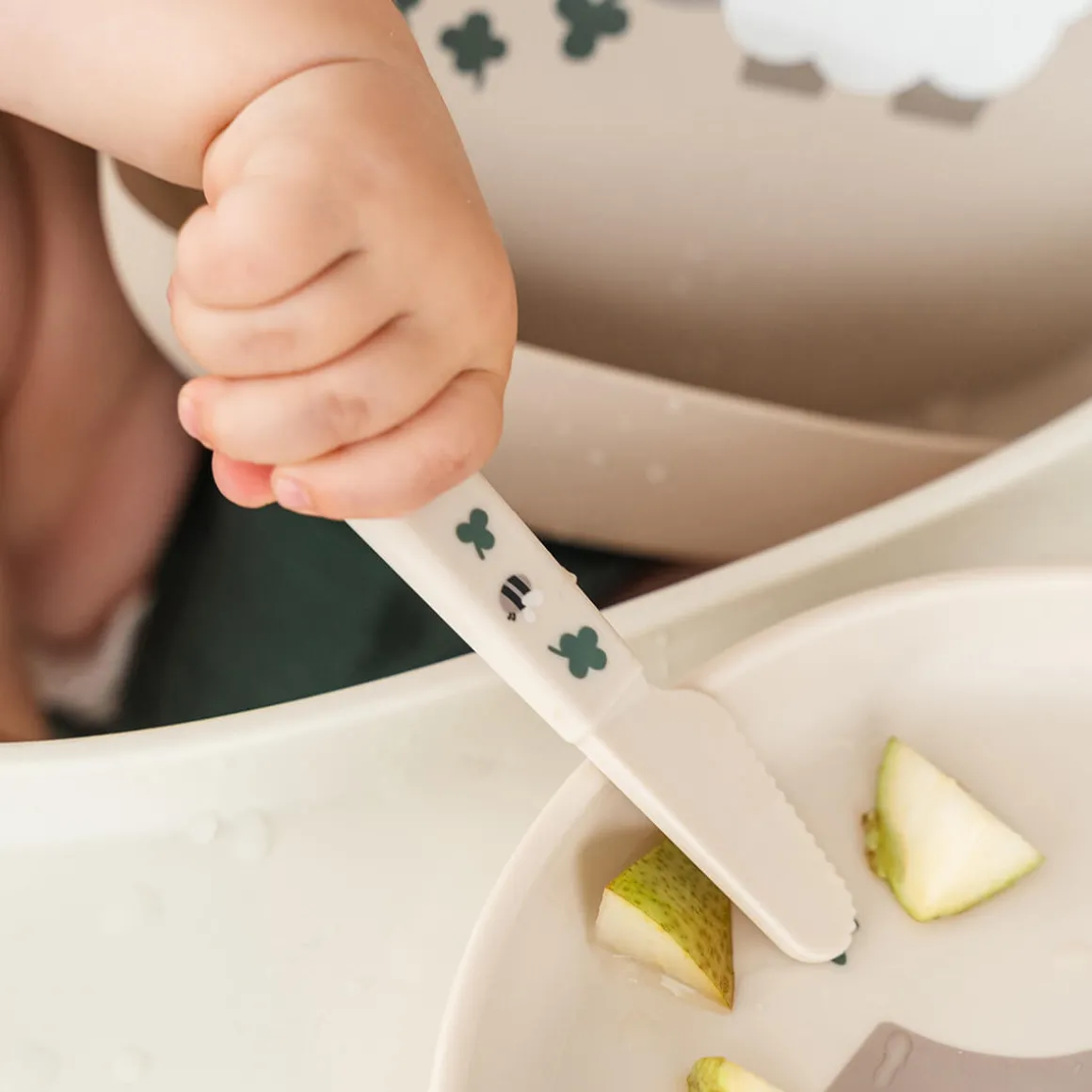 • Set de couverts avec des bords arrondis pour que l’enfant puisse manger en toute sécurité