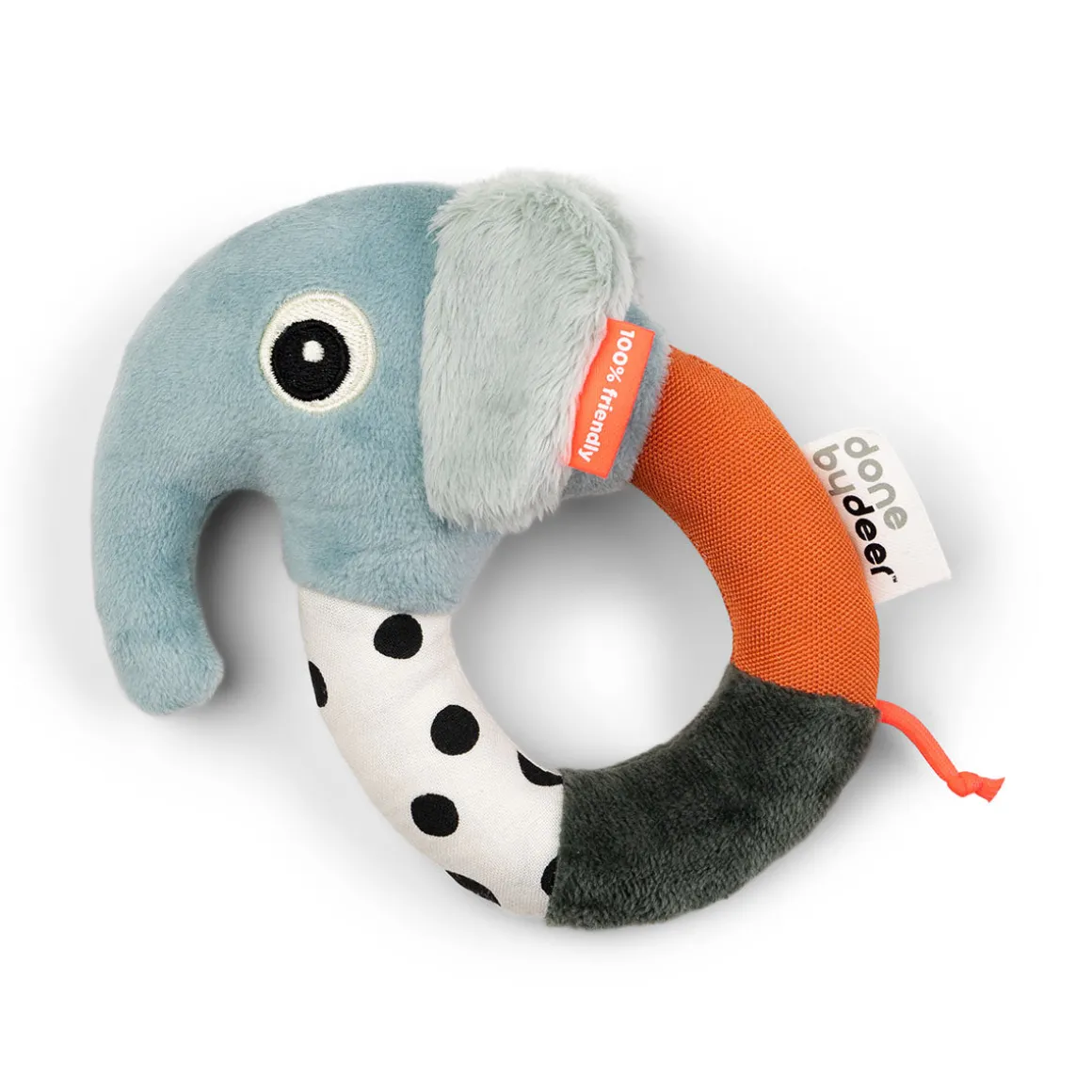 Le hochet à anneau souple comporte de multiples éléments qui stimulent votre bébé. Les nombreuses couleurs et textures le rendent amusant à regarder et à toucher. Elphee fait un joli bruit de hochet lorsqu’on le secoue, et les oreilles produisent un drôle de papier bruissant.