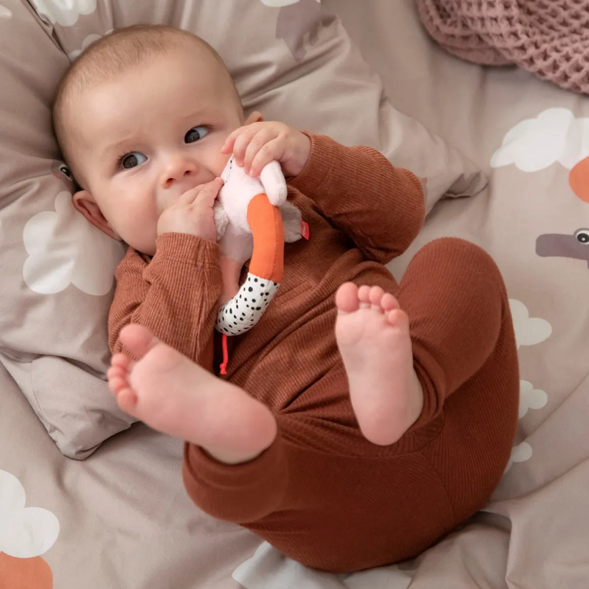 – Hochet aux couleurs contrastées et aux papiers bruissants pour divertir et stimuler les sens de votre bébé.