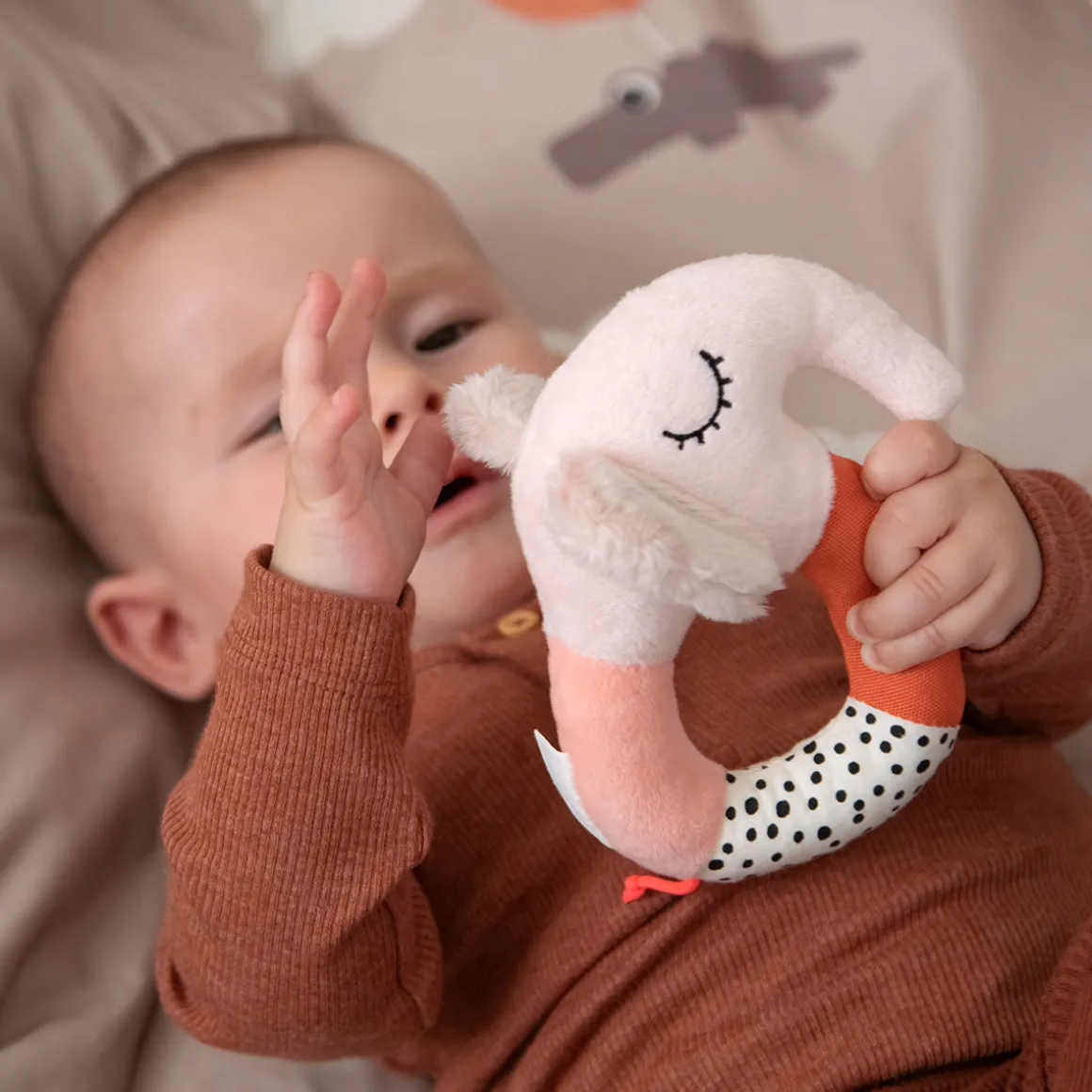 Le hochet à anneau souple comporte de multiples éléments qui stimulent votre bébé. Les nombreuses couleurs et textures le rendent amusant à regarder et à toucher. Elphee fait un joli bruit de hochet lorsqu’on le secoue, et les oreilles produisent un drôle de papier bruissant.