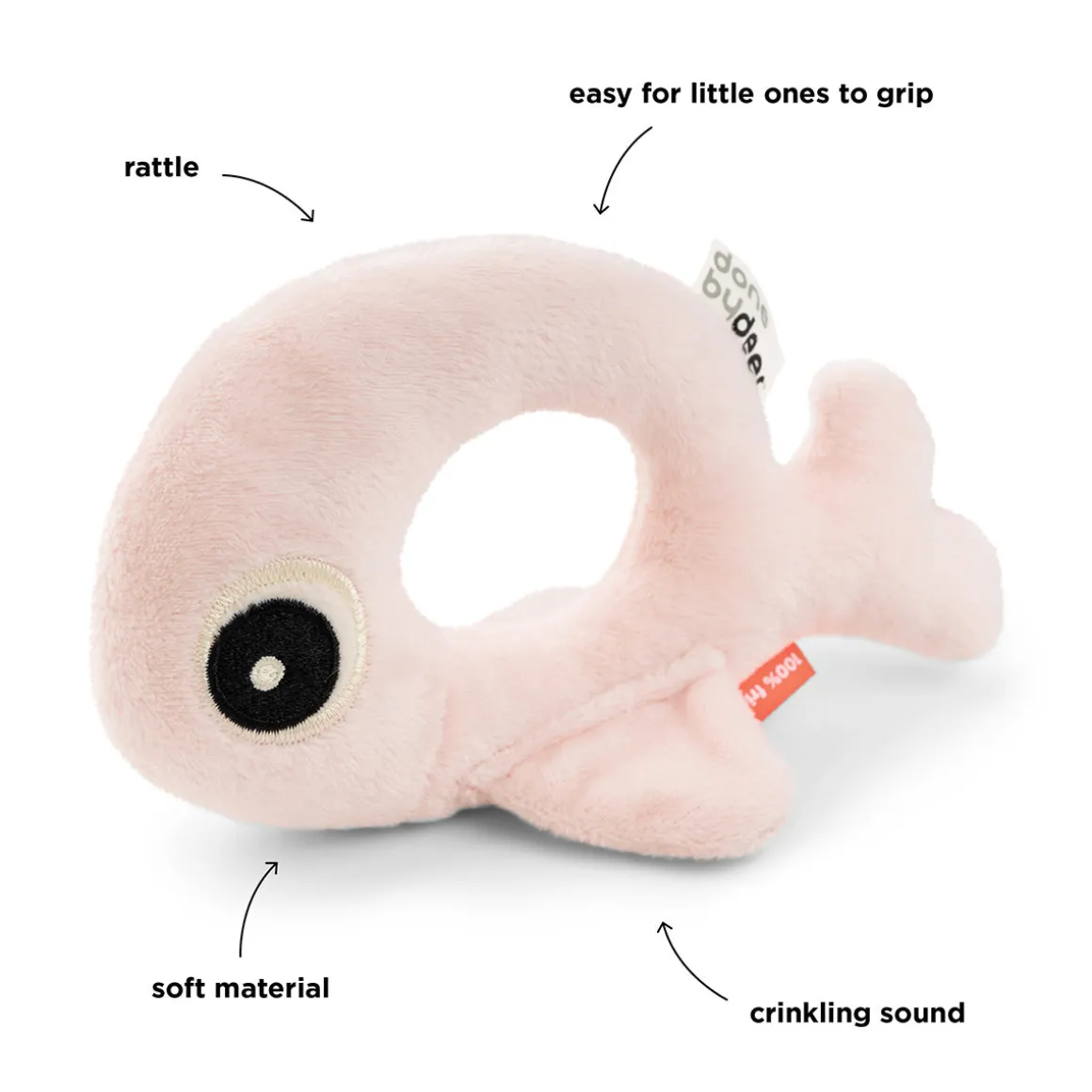 Le hochet en forme d’anneau fait un joli bruit de hochet lorsqu’on le secoue et les nageoires font un drôle de papier bruissant lorsqu’on les touche. Les ailettes permettent au hochet de tenir debout tout seul et conviennent à l’heure du ventre.
