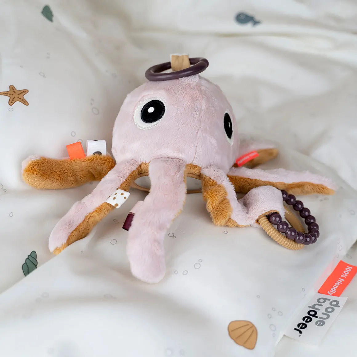 Grâce au toylink, vous pouvez attacher l’adorable méduse à un landau, une poussette, un siège auto ou un parc pour enfants – toujours à portée de main de votre enfant. La Moutarde/Rose est d’un ton doux et poudré, avec des tons contrastés de moutarde à l’intérieur des bras.
