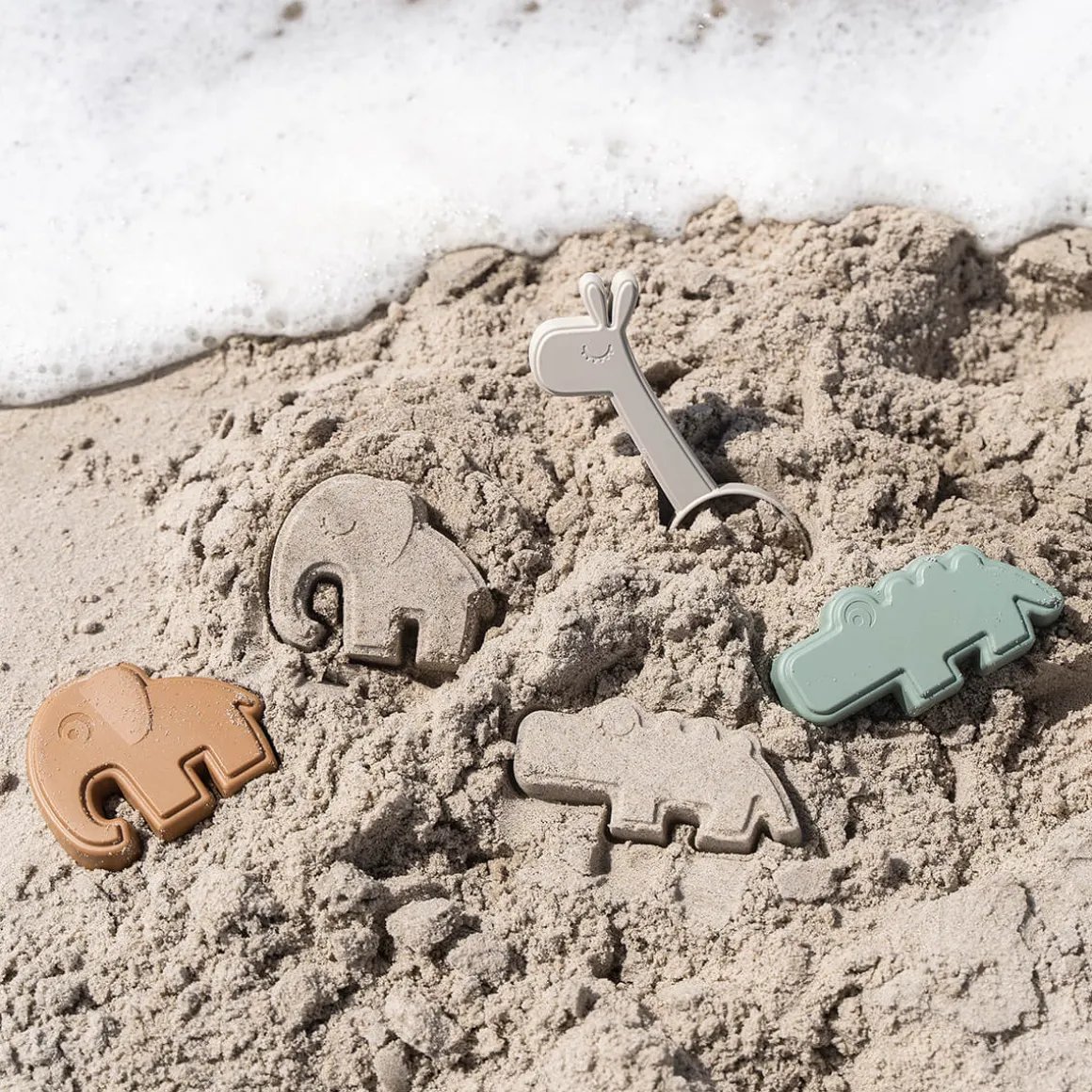 Un ensemble de jeu de sable parfait pour tous les tout-petits avec un moule de crocodile et un moule d’éléphant, et une pelle de lama – le tout dans de douces nuances de vert, de sable et de moutarde.