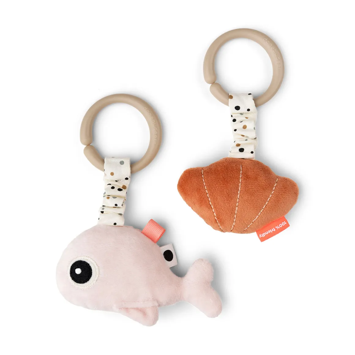 L’ensemble de jouets d’activité à suspendre est composé d’une Rose et d’un coquillage de couleur Papaye, tous deux munis d’un élastique avec des points ludiques.