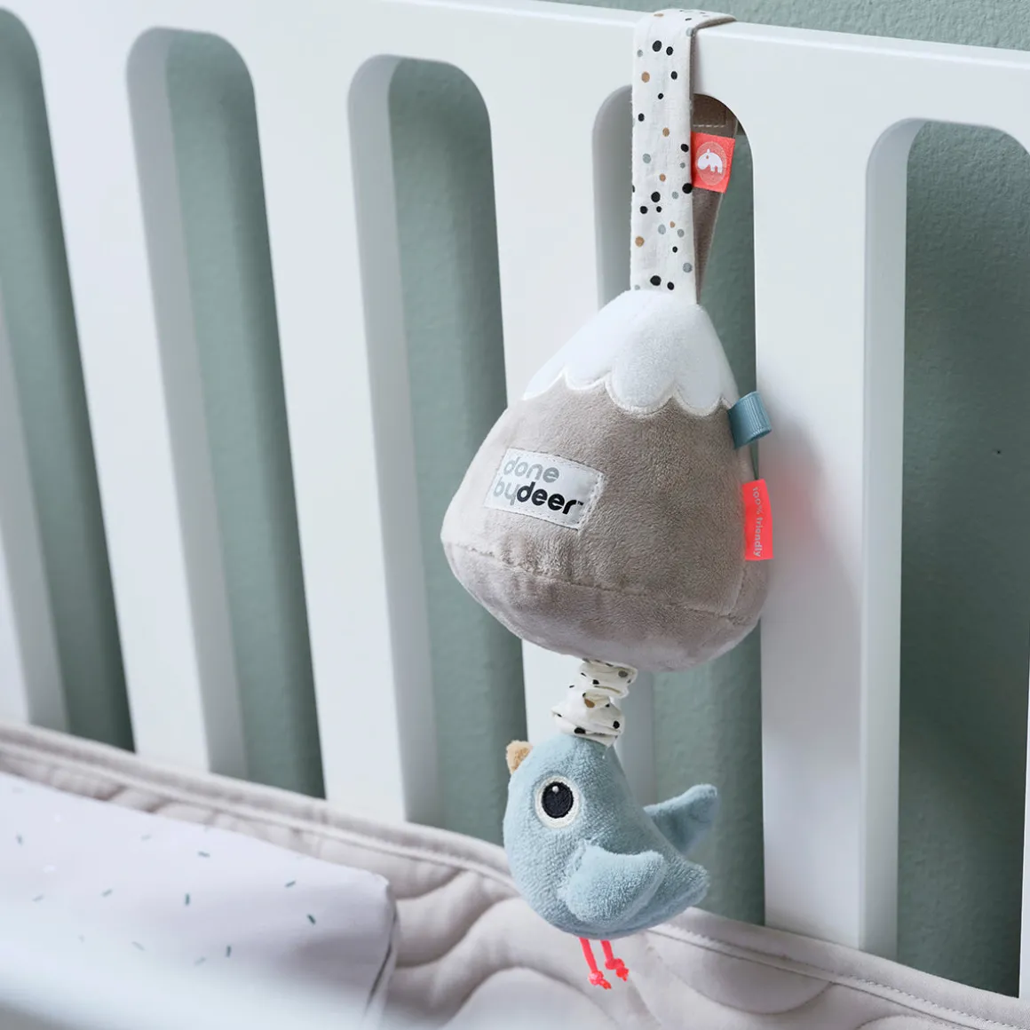 Le doux jouet musical pour bébé représente une montagne grise avec de la neige blanche et de jolis rubans avec des happy-dots colorés. Sous la montagne, le petit birdee bleu aux pieds rouge corail s’envole au rythme de la musique.