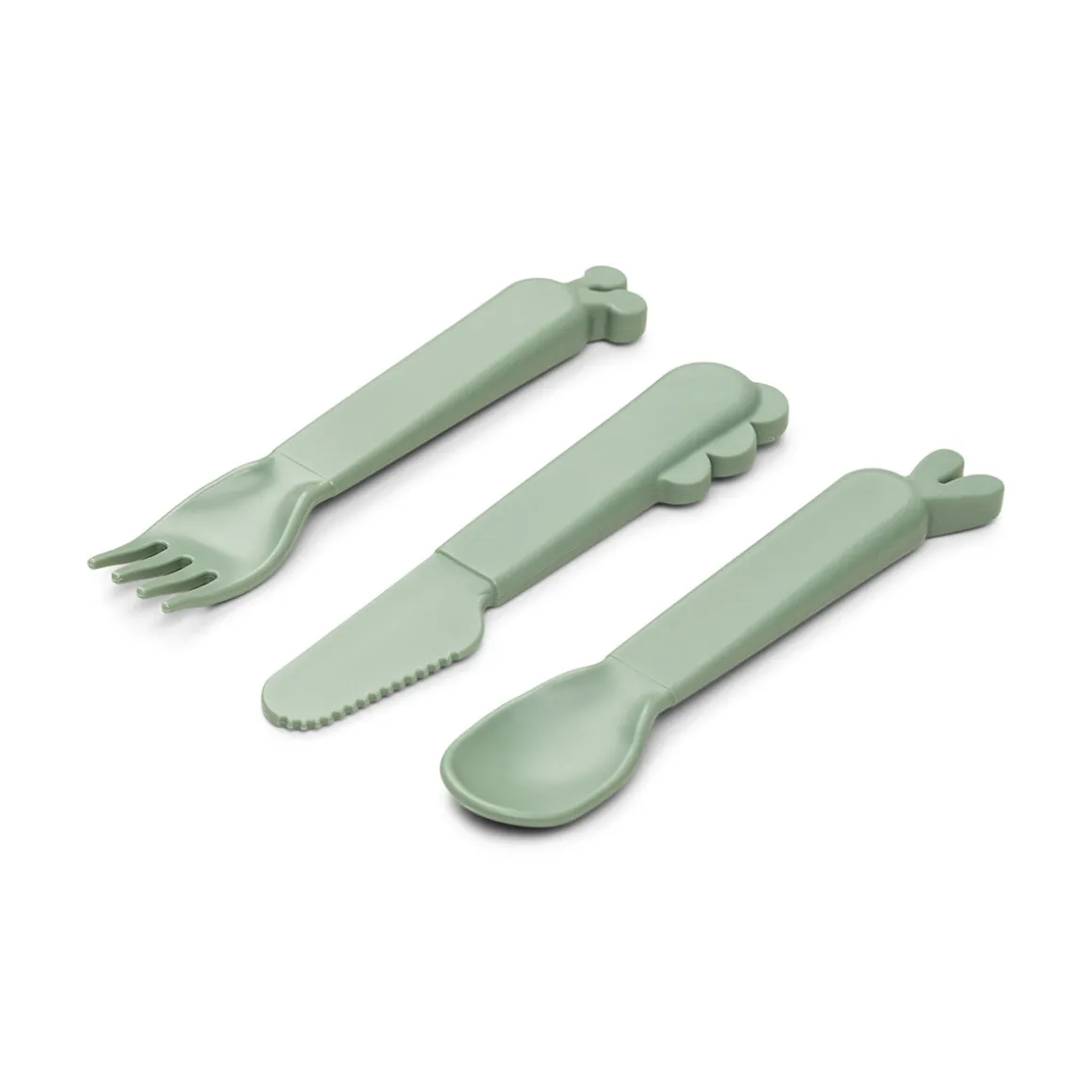 Les couverts verts sont composés d’une cuillère avec des oreilles de Lalee, d’une fourchette avec des oreilles de Raffi et d’un couteau avec des écailles de Croco. Les couverts ont une surface mate et soyeuse et sont assortis au reste de la collection Kiddish.