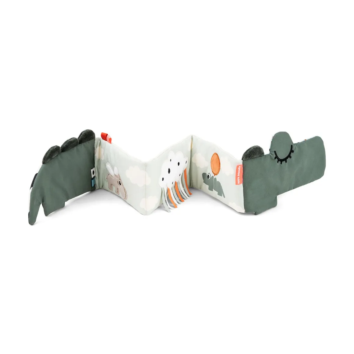 Le livre souple dépliable est rempli de couleurs et d’éléments joyeux. Le crocodile vert réserve des surprises passionnantes sous la forme de points ludiques de différentes couleurs et de rayures contrastées en noir et blanc.