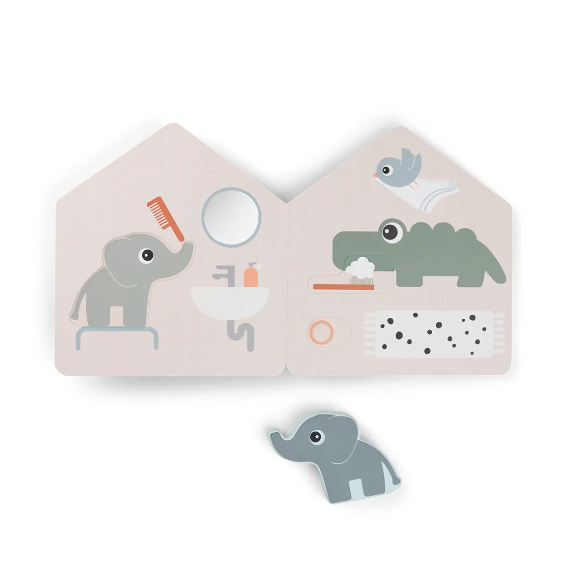 Livre cartonné interactif avec Elphee, notre adorable éléphant. Conçu pour ouvrir la porte au jeu imaginatif, ce livre encourage votre enfant à créer des histoires et à s’engager avec des éléments stimulants. Jouez avec la petite figurine en bois d’Elphee, en la déplaçant d’une page à l’autre pour créer des histoires passionnantes. Tourner les pages développe la motricité fine de votre enfant.