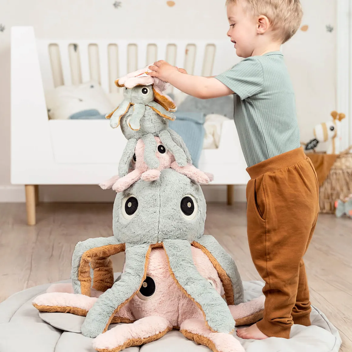 Les tout-petits peuvent câliner les nombreux bras de Jelly et trouver du réconfort en les tenant alors qu’ils s’en vont au pays des rêves.
