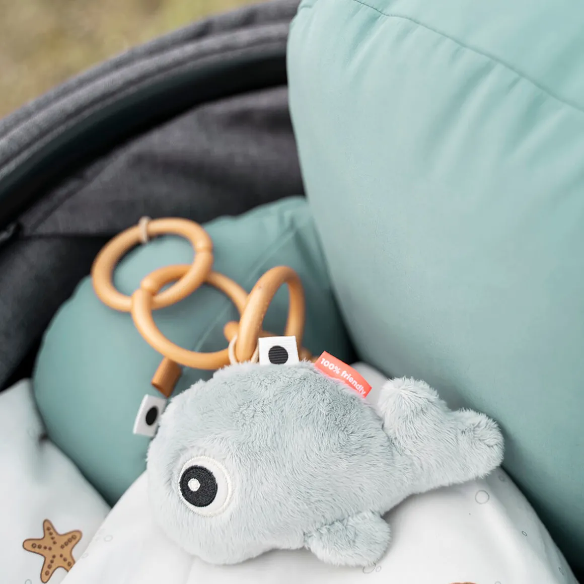 Grâce à la boucle élastique, il est facile d’attacher le petit hochet sensoriel à un tapis d’éveil, à une poussette, à un siège auto ou à un centre d’activités à l’aide d’un lien pour jouets. Le petit hochet baleine super doux est d’un ton bleu tendre.