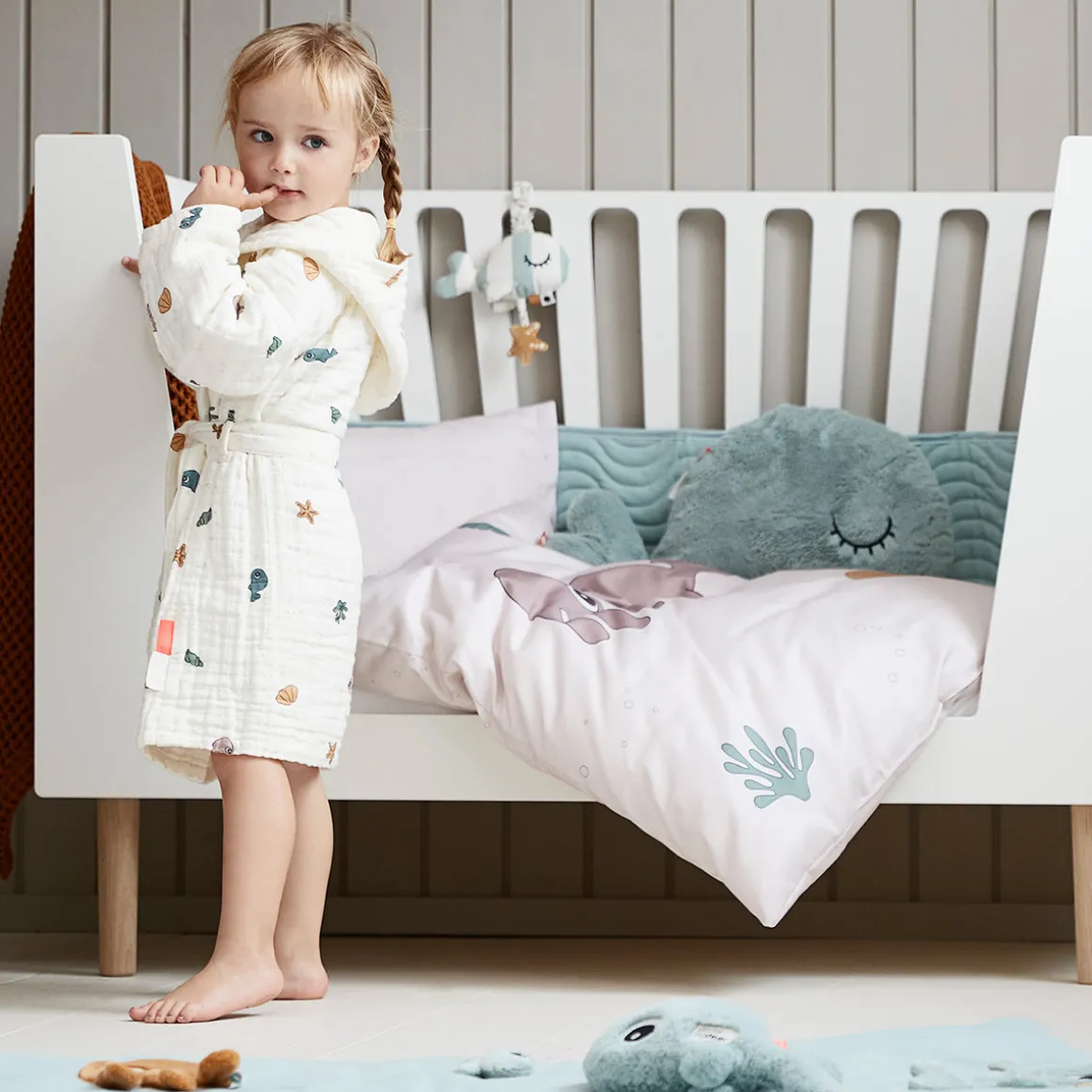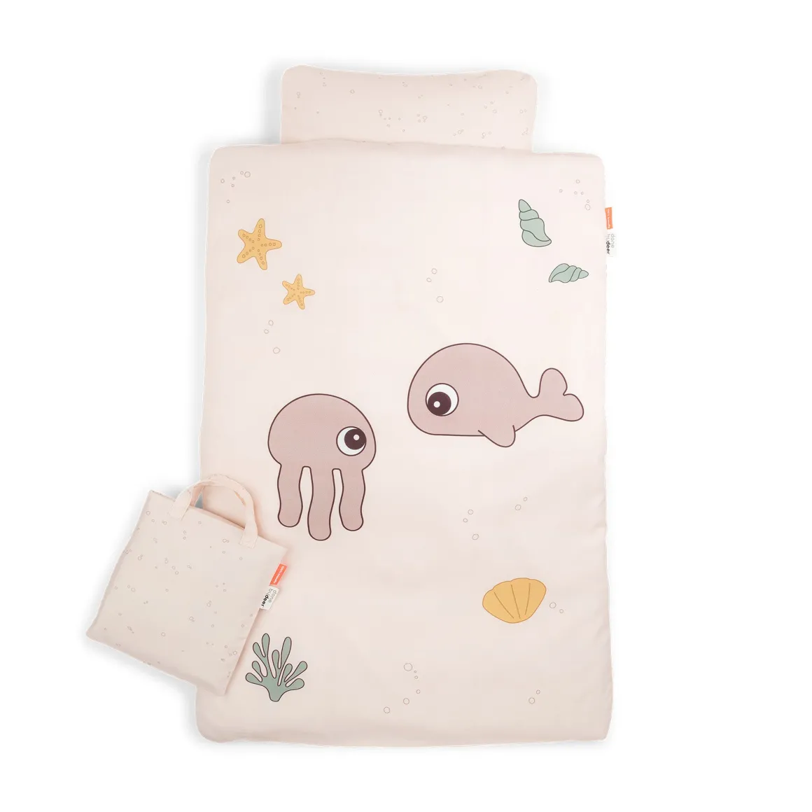 La parure de lit a un ton poudré avec des éléments de vie marine comme des coquillages, des récifs coralliens, des étoiles de mer et les deux amis de la mer Jelly et Wally dans des tons de poudre, de moutarde et de vert. L’envers est décoré d’un joli imprimé de bulles assorti au sac fourre-tout.