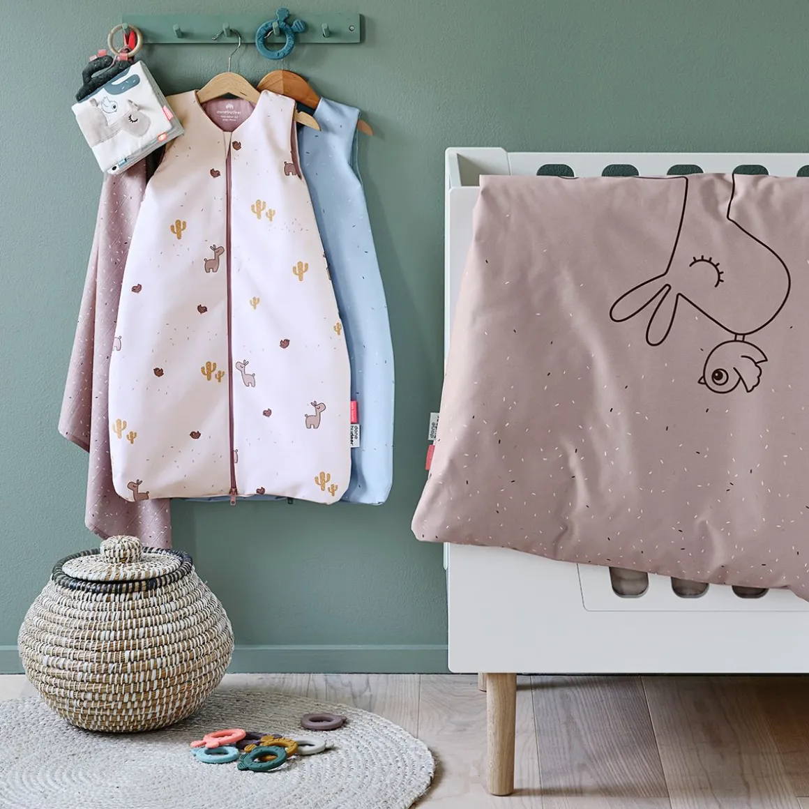 Le parure de lit bébé a un ton général poudre avec Lalee, Birdee – et confetti sur le devant. L’envers est saupoudré d’un mignon imprimé de confettis assorti au sac fourre-tout.