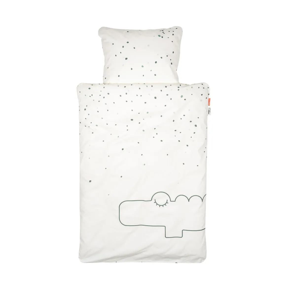 Le linge de lit bio pour enfants a un ton général sable clair avec des feuilles tropicales dans différents tons de vert et un croco très endormi.