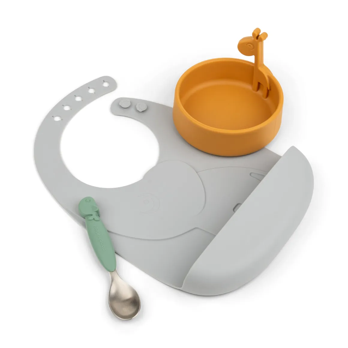 Les enfants apprécieront que les animaux se joignent à eux à l’heure du repas – la poche d’Elphee attrape les aliments qui manquent et Raffi les encourage à franchir l’étape excitante de manger tout seul. Cet adorable coffret est disponible dans un mélange de gris, de vert et de moutarde.